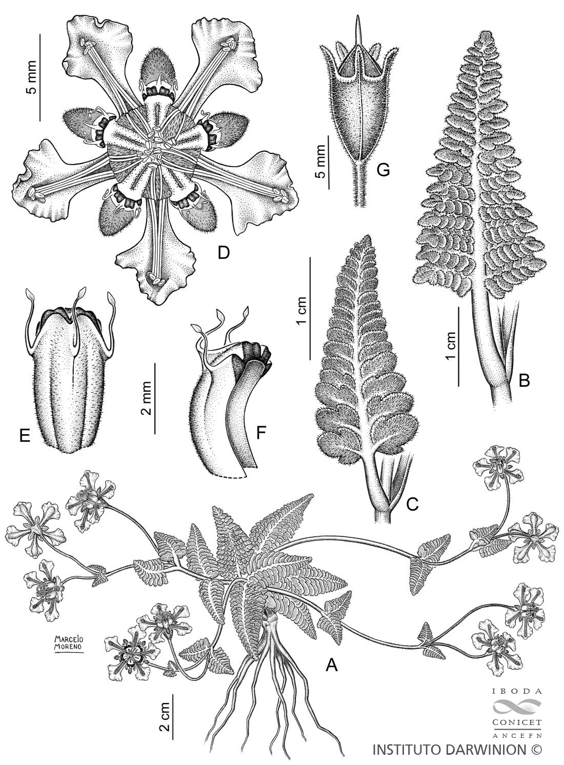 Planta perenne cespitosa a decumbente, con raíces fibrosas, pubescente, con tricomas escabrosos de base ancha y tricomas gloquidiados; tallos de 4-15(-25) cm, postrados a ascendentes, a veces fuertemente curveados. Hojas opuestas, pubescentes; pecíolos de 3-30 mm de largo, algo envainadores; láminas estrechamente ovadas a elípticas, de 5-30(-50) × 2-5 (-10) mm, pinnatisectas a pinnadas, segmentos ovados, a veces con 2 lóbulos, cara adaxial con predominio de tricomas escabrosos, la cara abaxial con predominio de tricomas gloquidiados. Inflorescencias monocasios paucifloros, a veces flores solitarias. Flores 5-meras; cáliz con segmentos de 3-5 × 2-3 mm en la base, lanceolados, pubescentes, márgenes y vena con predominio de pelos gloquidiados largos, áreas entre ambos con tricomas escabrosos y gloquidiados más cortos; pétalos de 6-10 × 3-7 mm y 1,5-5 mm de profundidad, espatulados, cóncavos, laciniados, crespos, blancos (raras veces amarillos), cara externa con una línea longitudinal verde oscuro en la quilla, predominio de pelos gloquidiados y cara interna glabra o glabrescente; escamas nectaríferas subrectangulares, de 4-5 × 2-3 mm, blancas, con marcas anaranjadas en el ápice, curvas en perfil, cóncavas, auriculadas en la parte lateral superior, sacciformes en la mitad inferior, borde superior engrosado y 2-lobulado con un doble arco en forma de “m” débilmente marcado, dorso de la escama con 3 quillas someramente aladas, extendiéndose más o menos hasta el sitio de inserción de los filamentos dorsales; filamentos dorsales filiformes, con el ápice filiforme o ligeramente expandido, insertos en la base del tercio distal de la escama, de longitudes subiguales, de 1-2 mm de largo, que sobrepasan bastante la altura de la escama; estaminodios de 5-6 mm de largo, 2 por escama nectarífera, con forma de “L”, parte inferior subrectangular, aplanada, pubescente, parte superior subfusiforme, papilosa con una prolongación abruptamente adelgazada, filiforme, por encima de la punta de la escama; estambres 8-20 por fascículo; filamentos de 5-8 mm de largo; anteras elipsoides, ca. 0,6 mm; ovario de ± 3 × 3-4 mm de diámetro en la parte superior, cortamente obcónico, placentas 3, óvulos numerosos; estilo de 3-5 mm de largo, 3-fido, pubescencia de ovario y estilo con predominio dé pelos escabrosos. Frutos cápsulas subglobosas a obcónicas, de 5-12 mm de largo × 6-10 mm de diámetro en la parte superior, 2/3 ínferas, pubescentes, dehiscentes por 3 valvas. Semillas no vistas.