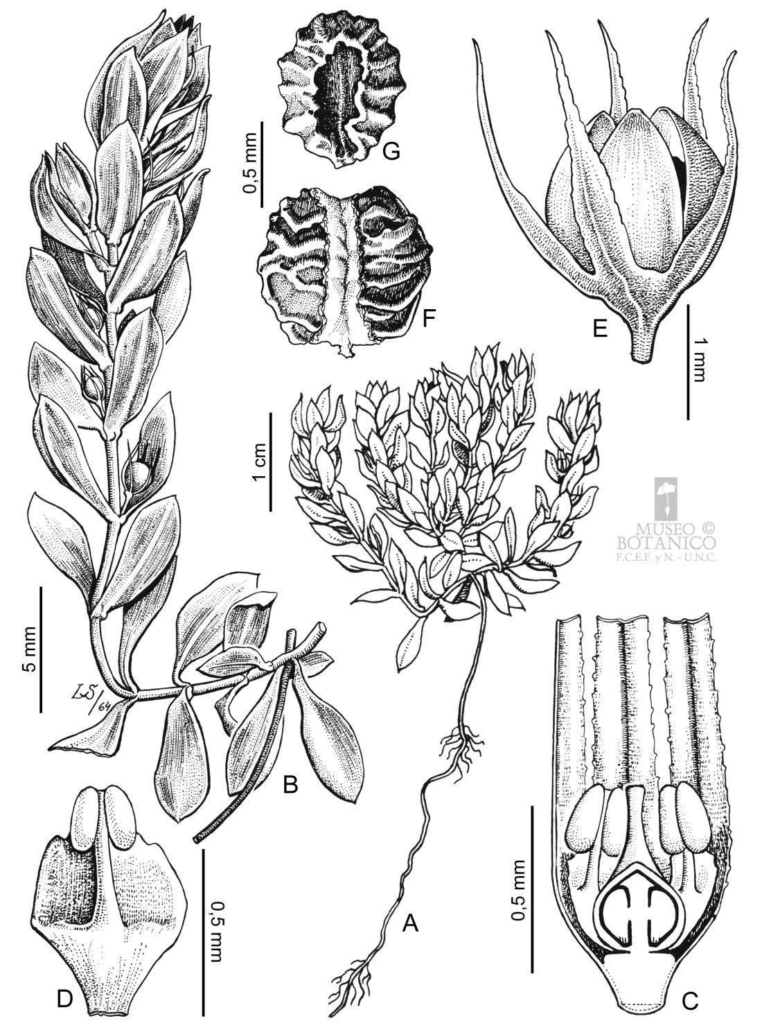 Hierba anual, de 2-10(-25) cm de alto, erecta o procumbente; tallos angulosos, simples o generalmente ramificados, subalados, no radicantes, glabros. Hojas opuestas, lanceoladas o elípticas, de 3-6 × 2-3 mm, sésiles, de ápice agudo, el margen finamente denticulado. Flores axilares, solitarias, subsésiles a cortamente pediceladas; cáliz 5-partido casi hasta la base, segmentos linear-lanceolados, de 2-3 mm de largo; corola 3(-5) partida hasta la base, lóbulos ovados, de 0,5-0,8 mm de largo, de 6 a 8 veces menores que el cáliz, blancos, cóncavos, de ápice agudo o a veces 2-lobados u obtusos; estambres 3, opositipétalos, insertos ca. en la mitad de los pétalos y apenas sobrepasándolos; ovario súpero, globoso, 3-carpelar, 1-locular; estilo corto, estigma capitado poco notable. Fruto una cápsula globosa, de 1,5-2 mm de largo, amarillenta, de dehiscencia 3-valvar. Semillas 2, ovoideas, ca. 1 mm de largo, planas a deprimido-convexas, de borde crenado, transversalmente rugosas, castaño-rojizas a negras.