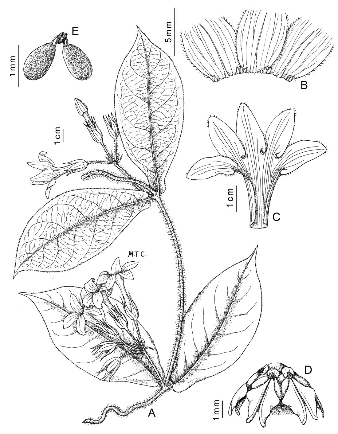 A. Rama florífera. B. Corola desplegada. C. Coléteres en el cáliz. D. Ginostegio. E. Polinario.