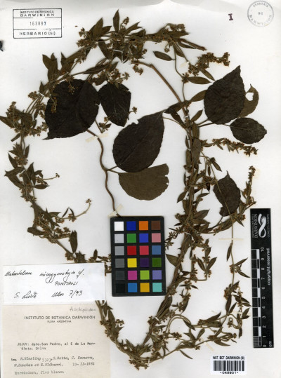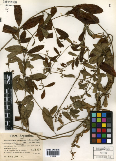 Material Tipo: Bolivia. Tarija. “ad arbores scandens in silvis prope Soledad, procul S. Luis”, 30 Ene 1904, K. Fiebrig 2676 (holotipo, B, †; lectotipo, M 0005534!, designado por S. Liede-Schumann, U. Meve & H. A. Keller, Fl. Vasc. Argent. 19(2): 108. 2021; isolectotipos, BM 000796240!, E 00259779!, F 0048996F!, fragmento, F 0048997F!, fragmento, GH 00076593!, GH 00076594!, GOET 000302!, K 000197134!, LIL 001163!, P 00644845!, S).