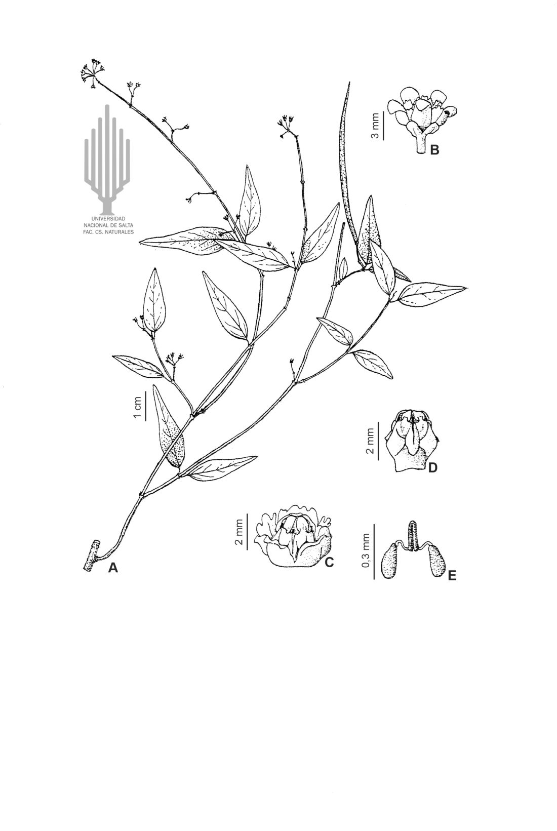 Plantas volubles de 2-3 m de alto, ramas rastreras, volubles o ascendentes, entrenudos glabros, de 20-90 cm de largo en ramas largas y de 10-20 cm en ramas cortas. Hojas con pecíolo de 2-4 de largo, con 1-3 coléteres ventrales en la base; láminas ovadas a lanceoladas, de 2,5-6 × 0,7-3,4 cm, base cuneada, ápice agudo, acuminado a cortamente atenuado, herbáceas, glabras. Inflorescencias axilares, ocasionalmente 2 por nudo, con 4-8 flores; pedúnculo de 2-6 mm de largo, glabro, esparcidamente piloso o con tricomas adpresos dispuestos en líneas longitudinales. Flores con pedicelo de 3-4 mm de largo, glabros o pubescentes; cáliz ciatiforme, con tricomas en el tubo, lóbulos ovados de 0,5-0,6 × 0,4 mm, ápice redondeado, un coléter bajo cada seno en la cara adaxial; corola campanulada, de 1,5-1,7 × 2-2,5 mm; blanca o crema; lóbulos oblongo-ovados, de 0,5-0,6 mm de ancho, fusionados un poco por debajo de la mitad, patentes, ápice redondeado y recurvo, cara adaxial papilosa; corona estaminal de 0,9-1,2 mm de largo, crema, apenas más larga a apenas más corta que el ginostegio, lóbulos rectangulares a anchamente deltados, fusionados en el cuarto basal, apicalmente 3-fidos o con incisiones irregulares, con los segmentos laterales más cortos que el central, ginostegio cónico, de 1 × 1 mm, sésil; anteras trapezoidales, de 0,4-0,45 mm de largo; apéndices conectivales anchamente ovados, de 0,2 × 0,2 mm; cabeza estigmática de 0,2 × 0,6 mm, amarilla; retináculo elipsoide, de 0,1-0,12 × 0,04 mm, caudículas cilíndricas de 0,06 mm de largo, polinios claviformes, de 0,12-0,15 × 0,045-0,055 mm. Folículos generalmente geminados, en ángulo de 135-150° uno respecto del otro, estrechamente oblongos, de 50-60 × 1-2 mm, ápice aguzado, glabros. Semillas de 7-9 × 1,5-2 mm.