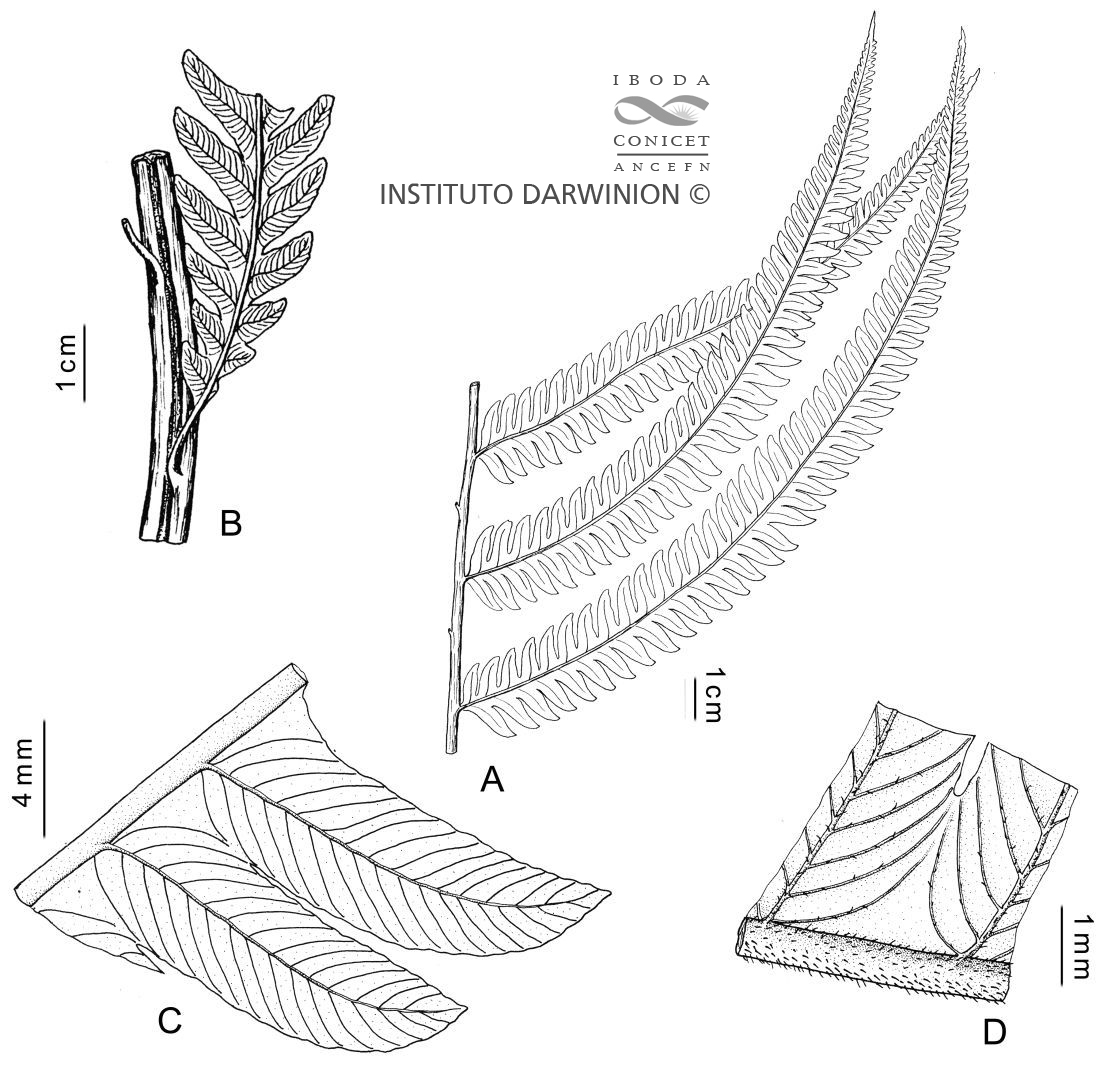 Rizomas rastreros, de 1-2 cm de diámetro, escamosos en el ápice. Frondes algo distanciadas, de 1,5-2 m de largo; pecíolos pajizos, 1/ 2 de la longitud total de la fronde, de 6-12 mm de diámetro, pubérulos a glabrescentes, escamosos y oscurecidos en la base; con escamas rojizas, angostamente triangular-lanceoladas, pilosas; láminas de contorno subtriangular, de 40-60 cm de ancho, ápice pinnatífido abruptamente reducido, similar a una pinna lateral, coriáceas, verde grisáceo oscuras cuando secas; raquis pajizos, pubérulos; pinnas elíptico-lineares, de 1,5-3 cm de ancho, ápice largamente atenuado, subsésiles o con pecíolulos de 1-2 mm de largo, el par inferior levemente o no reducido; costas adaxiales con pelos setiformes cortísimos (púas) o glabras, costas abaxiales diminutamente pubérulas, con pelos ca. 0,1 mm de largo, con escamas diminutas, pilosas, de 0,4-1,4 mm de largo, inconspicuas; segmentos lineartriangulares, falcados, agudos, con margen entero levemente revoluto, de 3-4 mm de ancho, el primer y segundo par, a veces también el tercero, reducidos u obsoletos; venas libres, 10-22 pares, el par basal connivente en el seno, con apófisis membranácea en el seno; cara adaxial glabra, a menudo escabrosa, cara abaxial pilosa en la cóstula, venas y márgenes, con pelos simples, setiformes, de 0,08-0,15 mm de largo. Soros circulares, submarginales; indusios reniformes, glabros o con escasos pelos setiformes. Esporangios glabros. Esporas castañas, crestadas, lisas.