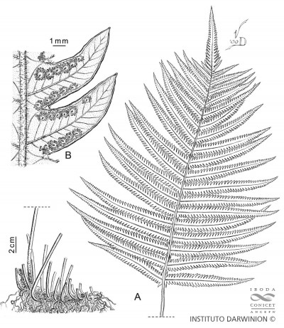 Rizomas rastreros, de 0,3-1 cm de diámetro, escamosos en el ápice; escamas castañas, triangular-lanceoladas, pseudoclatradas, glabras o con escasos pelos no glandulares y glandulares. Frondes distanciadas 1-4 cm, de 0,50-1,1(-1,3) m de largo; pecíolos pajizos, 1/3-1/2 del largo total de la fronde, de 3-5 mm de diámetro, glandulosos, glanduloso-pilosos o glabros, escamosos y oscurecidos en la base; escamas similares a las del rizoma; láminas de contorno triangular o subtriangular, de 15-40 cm de ancho, ápice pinnatífido, papiráceas a cartáceas; raquis pajizos, glandulosos o glanduloso-pilosos; pinnas medias y apicales lineartriangulares, pinnas basales linear-elípticas, sésiles, extremo agudo o atenuado, de 1,5-2,5(-3) cm de ancho, el par basal no o levemente reducido, algunas veces reflexo, costas glandulosas o glandulosopilosas, pelos aciculares cortos, muy escasos, pelos glandulares 1-celulares, capitados, hialinos, densos, y pelos glandulares paucicelulares, pedicelados y con cabezuela rojiza, menos frecuentes, con escamas castañas, pilosas, escasas y diminutas, de 0,3-0,5 mm de largo sobre la costa abaxial; segmentos falcados o subfalcados, de ápice agudo, el margen entero, plano o levemente revoluto, de 3 mm de ancho, con 9-15 pares de venas, el par basal libre con la vena basiscópica sin alcanzar el margen del seno o connivente debajo del seno, con apófisis membranosa en el seno, segmentos basales paralelos al raquis, elongados (por lo menos el acroscópico) de márgenes crenado-aserrados, los 1-3 pares siguientes levemente reducidos, cara adaxial con escasos pelos setiformes sobre la cóstula, venas y márgenes, cara abaxial glandulosa, a veces con escasos pelos simples, o glabra. Soros circulares, submarginales; indusios reniformes, glandulosos o glanduloso-pilosos, esporangios glabros. Esporas castañas a castaño muy oscuro casi negro, crestado-aladas.