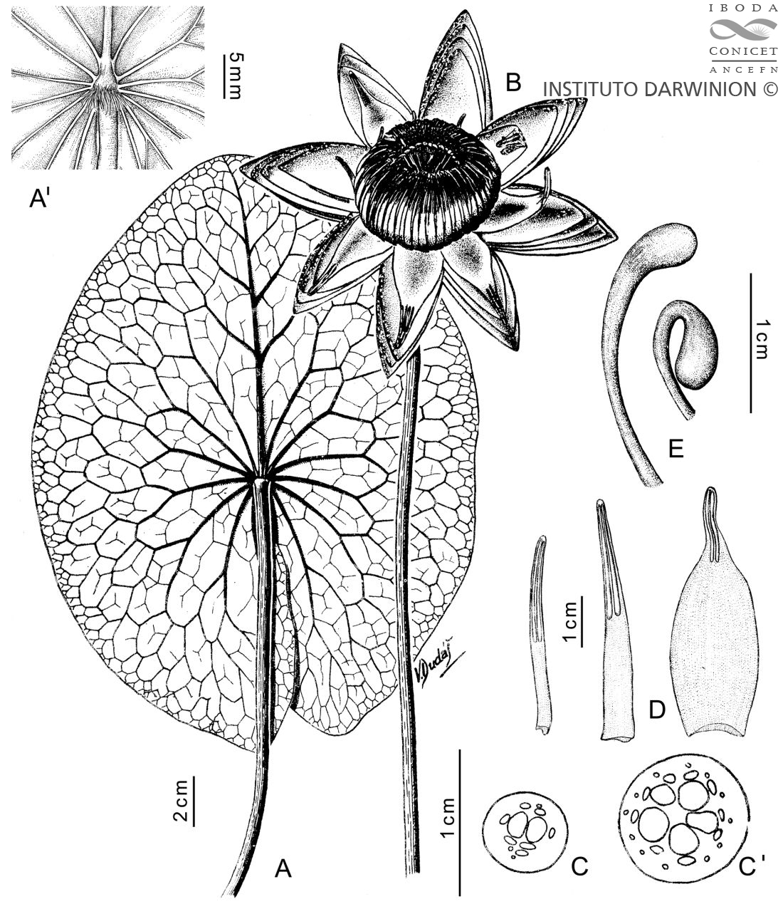 Plantas con rizoma lanoso. Hojas con pecíolos de 4-8(-10) mm de diámetro, con 8 canales aeríferos en sección transversal, generalmente con un anillo de pelos septados en el punto de inserción con la lámina; láminas elípticas a suborbiculares, de 10-22 × 9-20 cm, base con lóbulos redondeados a obtusos, a veces los bordes superpuestos, con un profundo seno basal que llega a 1-4 mm de la inserción del pecíolo, ápice redondeado, subcoriáceas, nervios principales 11-15, radiales, unidos por nervios transversales oblicuos que forman un retículo de hexágonos irregulares que disminuyen de tamaño hacia el margen. Flores solitarias, de 9-14 cm de diámetro, pedicelos de 5-10 mm de diámetro, con un anillo interior de 6-7 canales aeríferos mayores, rodeados por 12-14 de menor sección; cáliz compuesto por 4 sépalos ovados, de 5-7 × 2,5-4,5 cm, coriáceos; corola compuesta por 16-24 pétalos más cortos que los sépalos, blancos; androceo compuesto por 224-324 estambres, los más externos petaloideos ca. 5,2 cm de largo y con las anteras más cortas que los internos; gineceo compuesto por 28-47 carpelos, procesos estilares de 1-2 cm de largo, claviformes e incurvos. Fruto no visto.