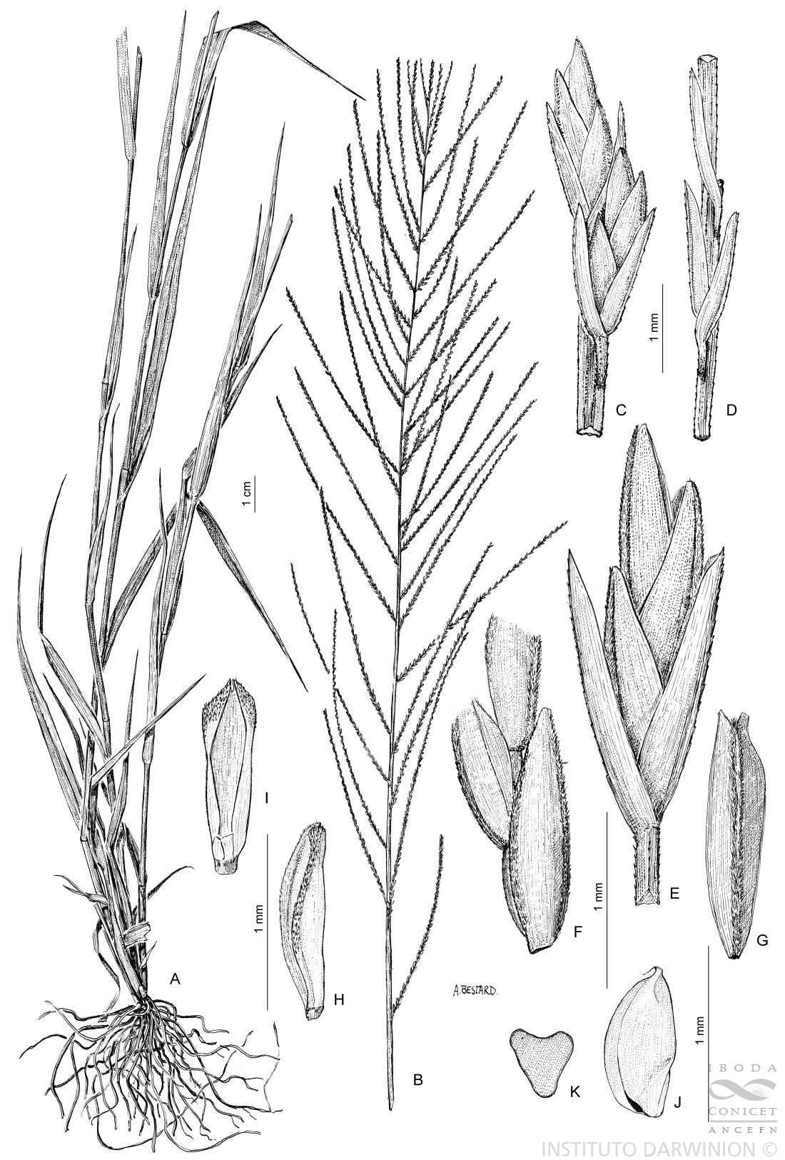A. Planta. B. Inflorescencia. C. Porción del raquis con dos espiguillas. D. Porción del raquis con glumas, los antecios han caído. E. Espiguilla. F. Antecio inferior y parte de los superiores. G. Lemma, vista dorsal. H. Pálea, vista lateral. I. Pálea y lodículas. J. Cariopsis,vista lateral. K. Cariopsis, transcorte.