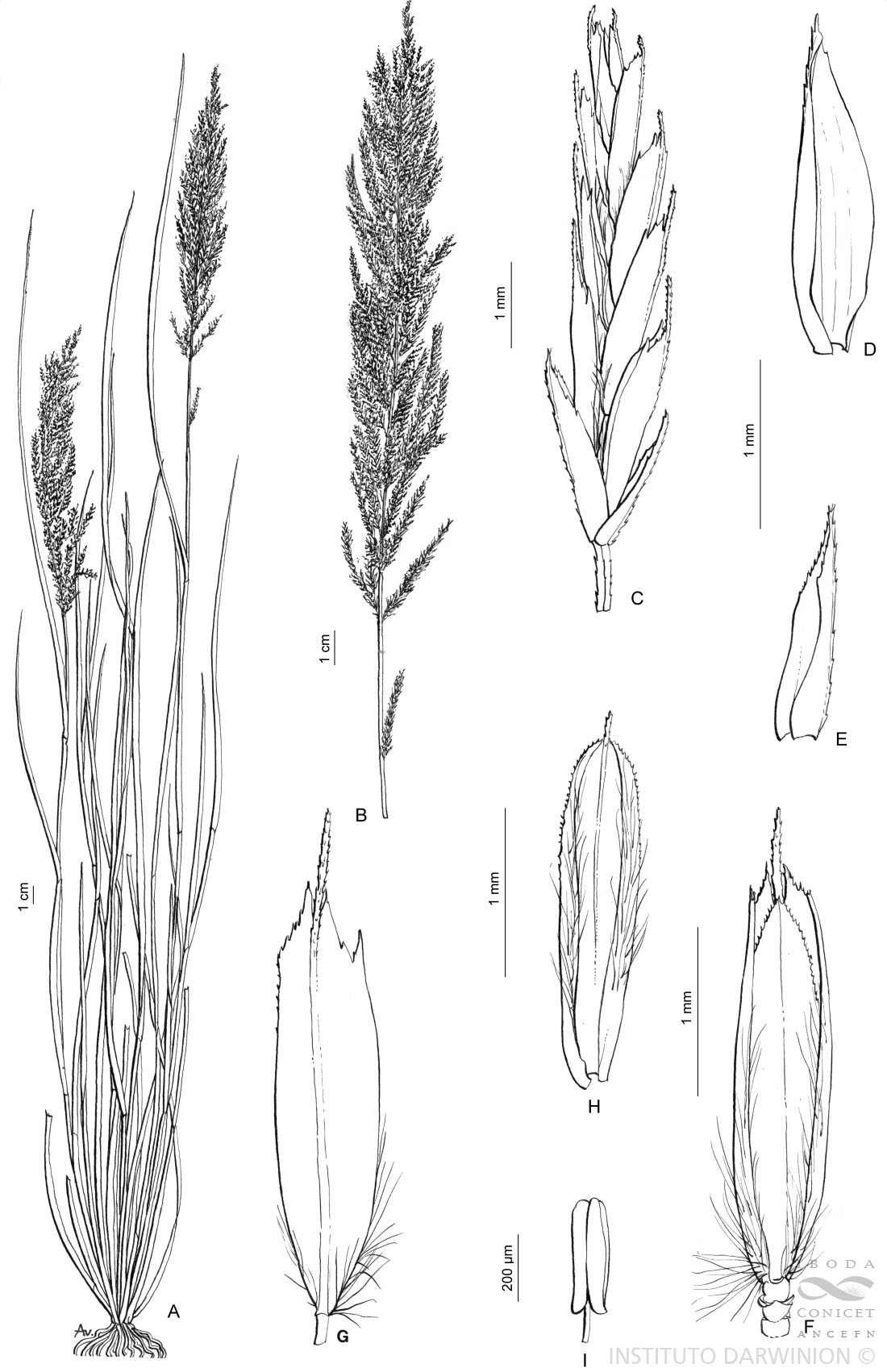 A. Planta. B. Inflorescencia. C. Espiguilla. D-E. Glumas. F. Antecio, vista ventral. G. Lemma, vista dorsal. H. Pálea, vista ventral. I. Estambre.