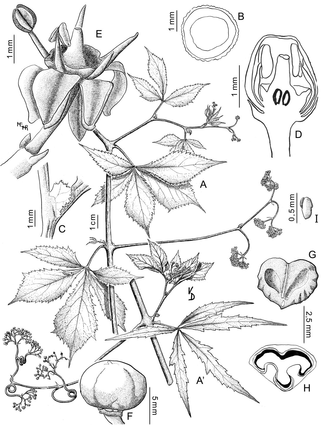 Liana; rizomas leñosos; tallos aéreos cilíndricos, estriados, violáceos, glabros; zarcillos ramifi cados dicotómicamente varias veces. Hojas con pecíolo de 1-4 cm de largo, canaliculado; láminas palmati-(3-)5-folioladas, raro hojas basales simples a lobuladas; folíolos elípticos u obovados de 4,5-17 × 1,5-7 cm, los laterales a veces oblongos o lineares, asimétricos, y de menor tamaño, base cuneada, ápice agudo, el margen irregularmente dentado a aserrado, glabros; peciólulos de 0,3-1 cm de largo; estípulas rectangulares, de 2-4 mm de largo, ciliadas, persistentes. Infl orescencias de 2,5-30 cm de largo; pedúnculos de 1-20 cm de largo, volubles, violáceos a pardo-violáceos; pedicelos de 0,2-0,3 cm de largo, en la fructificación de 0,5-1,5 cm de largo. Flores 5-meras, de 3 mm de largo, rojas a purpúreas; cáliz glabro; corola glabra; disco nectarífero 5-lobulado, carnoso, amarillo. Fruto una baya globosa, de 5-8 mm diámetro, violácea-oscura. Semillas 3-4, obcónicas, de 4 mm de largo, negras.