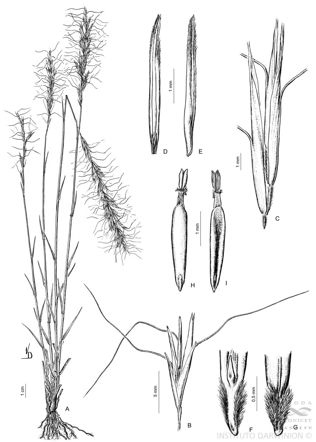 A. Planta. B. Espiguilla, vista lateral. C. Antecios. D. Pálea y lodículas. E. Pálea, vista lateral. F. Callo y base del antecio mostrando el artejo de la raquilla. G. Callo y base del antecio, vista dorsal. H. Cariopsis, vista escutelar. I. Cariopsis, vista hilar.