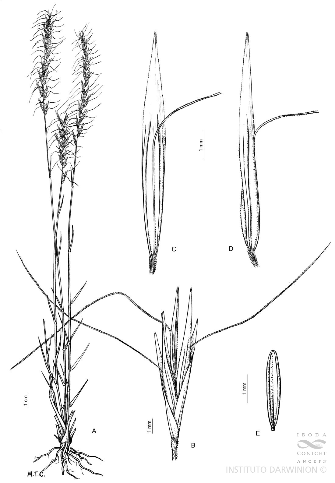 A, planta; B, espiguilla; C y D, antecio en vistas dorsal y lateral; E, cariopse.