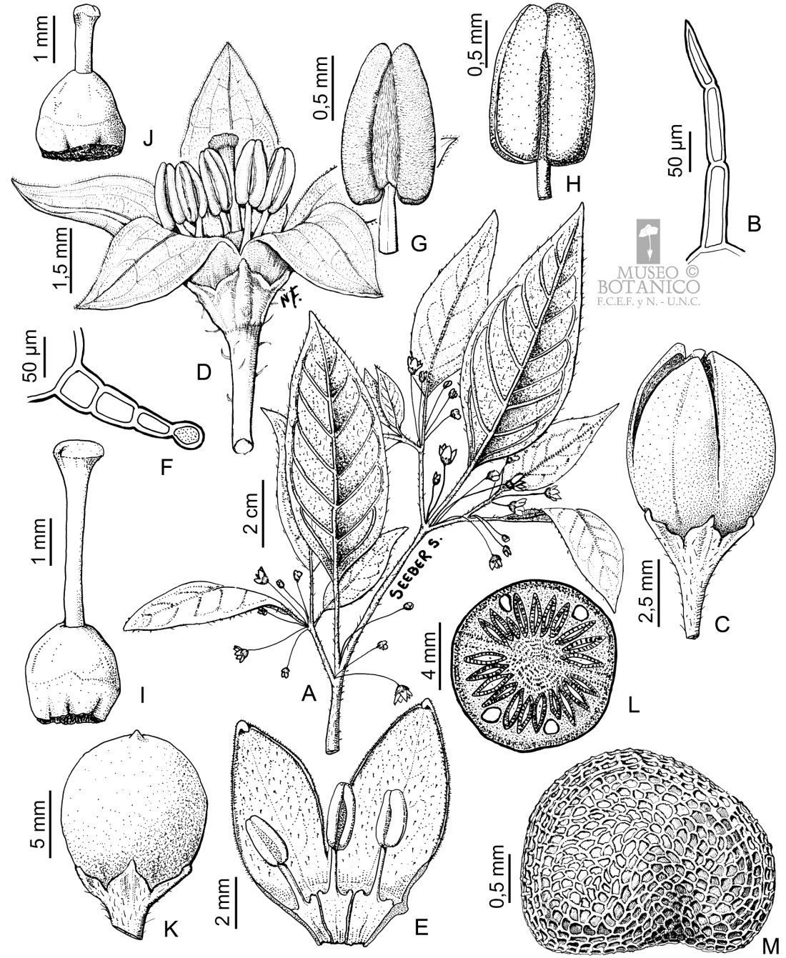 A. Rama florífera. B. Tricoma eglandular de hoja. C. Botón floral. D. Flor. E. Sector de corola desplegada. F. Tricoma glandular de corola. G. Estambre, vista dorsal. H. Estambre, vista ventral. I. Gineceo longistilo. J. Gineceo brevistilo. K. Fruto. L. Fruto, corte transversal. M. Semilla.