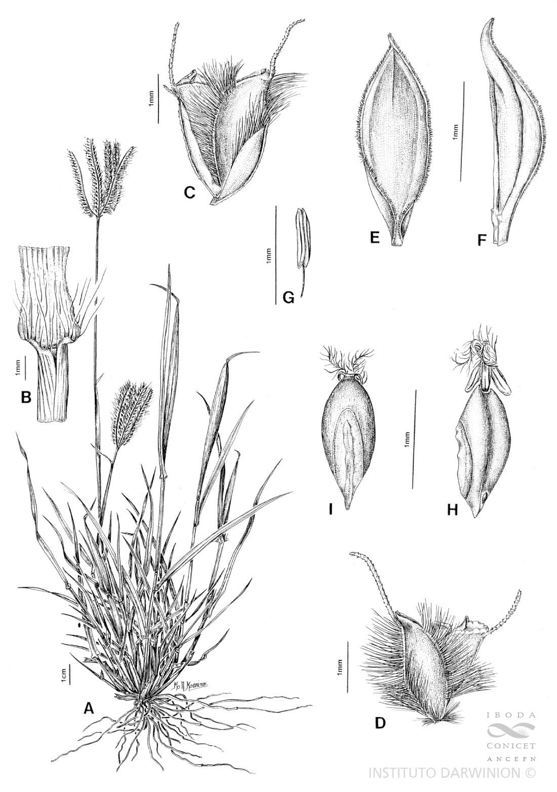 A. Planta. B. Región ligular. C. Espiguilla. D. Antecios inferior y superiores, vista lateral. E. Pálea, vista dorsal. F. Lodículas, vista lateral. G. Estambre. H. Cariopsis, vista lateral. I. Cariopsis, vista escutelar.