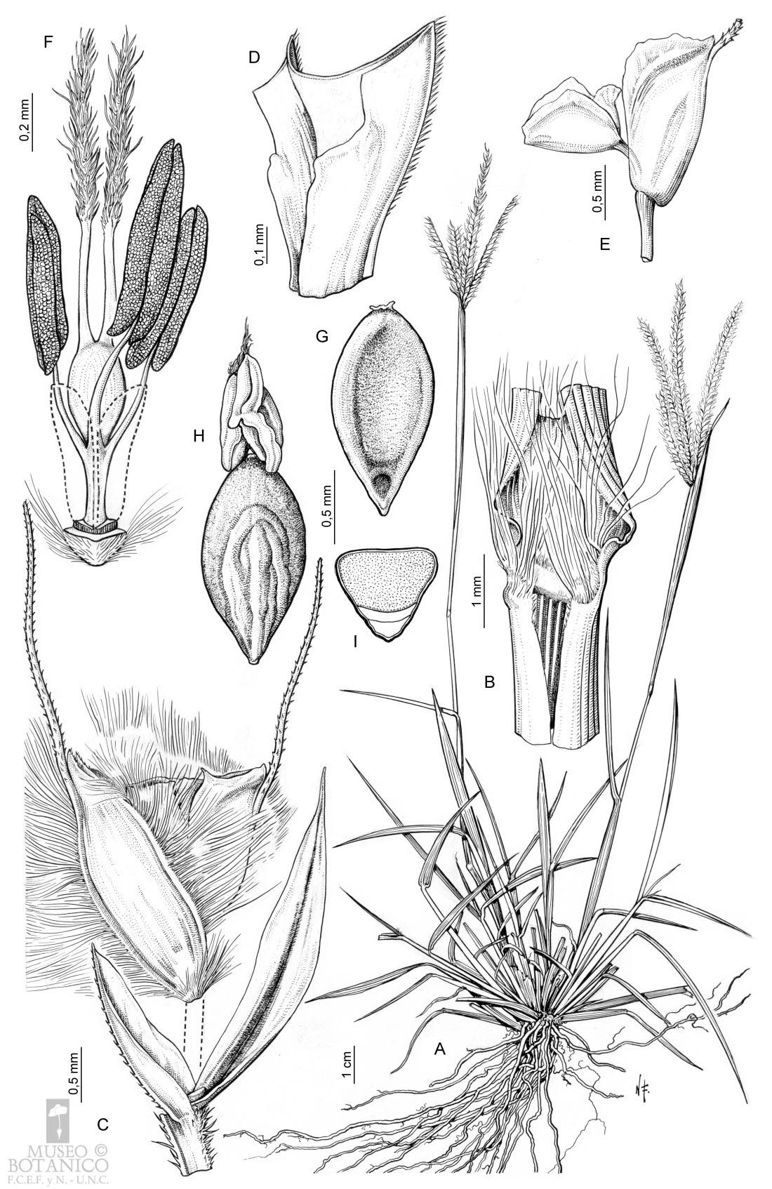 . A. Hábito. B. Lígula. C. Espiguilla, la raquilla articulada arriba de las glumas. D. Base de la pálea con las lodículas soldadas a ella en su borde distal, formando una pieza única. E. Antecios estériles (3), sólo el inferior aristado. F. Flor perfecta del antecio basal fértil, la flor es muy comprimida lateralmente de modo que los estambres laterales debieron desplegarse artificialmente hacia los costados, el estambre frontal tiene el filamento y la antera algo mayores que los laterales. G-I.