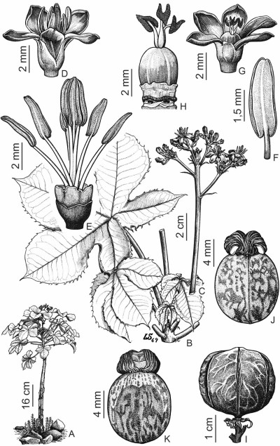 Arbusto o arbolito diclino-monoico, hasta de 5 m de alto, glabro; tronco grueso, carnoso. Hojas con pecíolos de 5-20 cm de largo, glabros, eglandulares; estípulas 3-7-laciniadas, ca. 5 mm de largo, glandulares; lámina 5-palmatipartida, de 10-21 × 10-21 cm, base profundamente cordada, discolora, cara abaxial glabrescente, cuando jóvenes algo pubescente; lóbulos elípticos a obovados, ápice acuminado, margen setáceo aserrado, sub-cartilaginoso, a veces en la base con dos glándulas estipitadas. Inflorescencias en cimas corimbiformes, largamente pedunculadas; brácteas lanceolado-lineares, las inferiores ca. 10 mm de largo, las superiores menores, glanduloso-ciliadas, finamente pubescentes. Flores amarillas con máculas rojas. Flores estaminadas con 5 sépalos ovado-oblongos, obtusos, mucronados, con algunos tricomas en la parte superior, borde setuloso, soldados casi hasta la mitad de su longitud; pétalos obovados u obtusos, ca. 13 mm de largo; disco nectarífero profundamente 5-lobulado o con 5 glándulas casi libres; estambres 7-10, monadelfos, en dos ciclos. Flores pistiladas con sépalos ovado-lanceolados, agudos, mucronados, margen setáceo-glanduloso; pétalos obovados, obtusos; disco con 5 glándulas soldadas; ovario glabro, estilos 3, casi libres, estigmas 2-fidos. Fruto una cápsula subglobosa, ca. 25 mm de largo, deprimida, lobulada. Semillas ca. 7,5 mm de largo, amarillentas con motas castañas, con carúncula prominente.