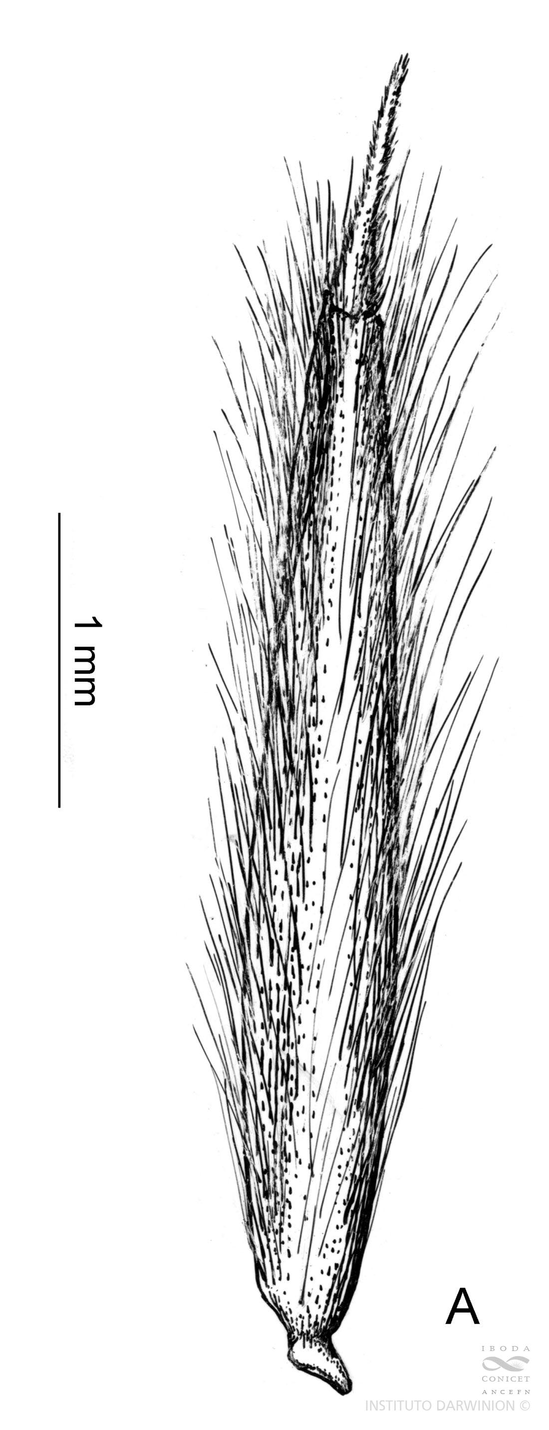 Plantas perennes, cespitosas, de 18-30 cm de alto; rizoma breve (1-3 cm de largo) y delgado; cañas cilíndricas, de 0,3-0,6 mm de diámetro, erguidas, rectas, simples, paucinodes; nudos poco conspicuos, pajizos o rojizos, glabros; entrenudos longitudinalmente estriados, glabros; vainas foliares estriadas, glabras o pubérulas, pubescentes, mayores que los entrenudos, con márgenes hialinos, lisos; zona del cuello inconspicua; lígulas membranáceas, glabras, de 1-4 mm de largo; láminas foliares lineares, convolutas, rígidas, de 4-10 cm x 0,3-0,4 mm, ambas caras estriadas, pubérulas, con bordes escabriúsculos. Inflorescencia erguida, pauciflora (9-20 espiguillas), de 3,5-6 cm de largo, con escasas ramas adpresas al raquis; raquis aplanado a cilíndrico, estriado, pubérulo, ramas y pedicelos cilíndricos, estriados, pubérulos. Espiguillas fusiformes, de 5-6 mm de largo; glumas membranáceas, subiguales, mayores que el antecio, 3-nervias, de 5-6 mm de largo, agudas, intensamente violáceas a la madurez del antecio, glabras; lemma membranácea, endurecida sólo en el ápice, cilíndrica, de 3-3,5 x 0,6 mm, finamente estriada, brillante, con pelos blanquecinos delgados, menores de 1 mm de largo sobre los nervios en los ? inferiores, y dispersos sobre toda la superficie en el ? apical; corona inconspicua o nula; arista mucroniforme, rígida, recta, angulosa, de 0,5-1,5 mm de largo, híspida, persistente; antopodio subagudo, menor de 0,2 mm de largo, glabro; pálea de igual longitud y consistencia que la lemma, plana, con pelos sobre los nervios y hacia el ápice; lodículas 3, de 0,7-0,8 mm de largo, una más angosta que las otras 2; cariopsis (inmaduro) elipsoidal, levemente angulosa, de 2 mm de largo.