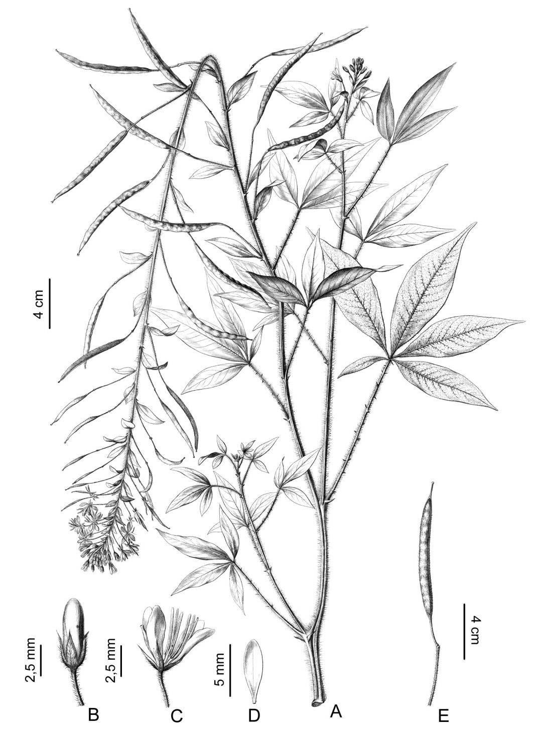 Hierbas o arbustos de 1 m de alto; ramas glandular pubescentes, pubescentes a glabrescentes. Hojas con pecíolos de 6-8,5 cm de largo, pubescentes a glabrescentes, armados con espinas cortas, rectas, delgadas a robustas; espinas estipulares de 2-3 × 1,5 mm, ligeramente curvadas en el ápice; peciólulos de 2-3 mm de largo, armados, pubescentes; láminas 3-7 folioladas; folíolos elípticos a ampliamente elípticos o elíptico-lanceolados, de 3,3-6,2 × 1-2 cm, basalmente atenuados a cuneados, apicalmente acuminados a largamente acuminados, margen sinuoso-ciliado a serrulado-ciliado, ambas caras glabras o raramente con tricomas eglandulares, cortos, puntiagudos y dispersos, nervadura central y venas secundarias glabras, con espinas. Inflorescencia en racimos corimbiformes, de 30 cm de largo, terminales; brácteas con pecíolos de 3-5 mm de largo, puberulentos y lámina ovada a elíptica, de11-16 × 5-10 mm, basalmente cuneada a redondeada, apicalmente aguda, margen serrulado-ciliado, ambas caras puberulentas. Flores con pedicelos de 17-19 mm de largo, glabrescentes; sépalos linear-triangulares a lanceolados, de 2,5-3 × 1 mm, agudos, abaxialmente glabrescentes, ciliados; pétalos obovados, de 5-6 × 2,5-3 mm, basalmente contraídos en una garra de 3-4 mm de largo, apicalmente obtusos, glabros, blancos; nectario cónico, notoriamente carnoso, persistente en el fruto; filamentos estaminales de 20-23 mm de largo, violetas, anteras de 2,5-3 mm de largo; ovario cilíndrico, de 4-5 mm de largo, glabro; estilo 1-2 mm de largo, persistente en el fruto, estigma marcadamente capitado. Frutos cilíndricos, de 6-9 × 0,3-0,5 cm, ligeramente torulosos, pubescentes a glabros; ginóforo de 2,1-2,5 cm de largo. Semillas suborbiculares, de 2-2,5 × 1-1,5 mm, aparentemente lisas, longitudinalmente estriadas y finamente estriadas transversalmente, hendiduras cubiertas por una membrana delgada y opaca.