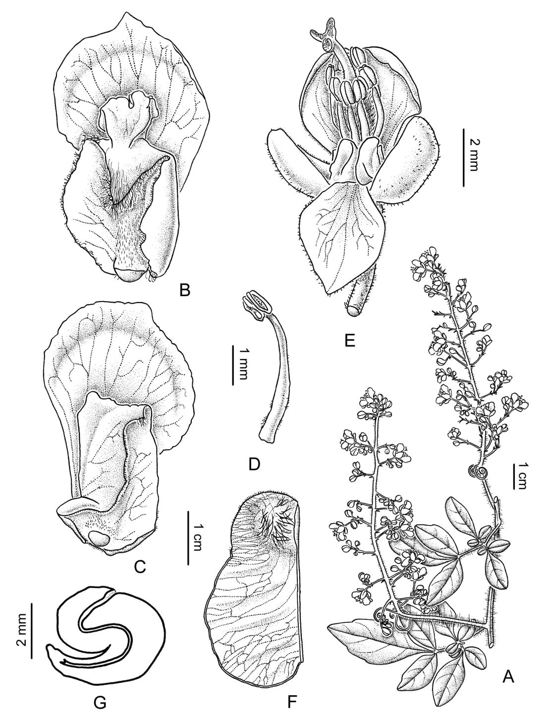 A. Rama florífera. B. Pétalo posterior, cara interna. C. Pétalo anterior, cara interna. D. Estambre de la flor estaminada. E. Flor pistilada sin la corola, se aprecian los lobos nectaríferos posteriores. F. Mericarpo. G. Embrión.