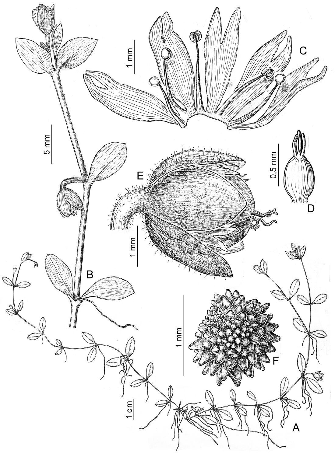 Hierbas anuales, rastreras, cespitosas, de 5-15 cm de alto, ramificadas desde la base; tallos filiformes, subcuadrangulares, radicantes en los nudos inferiores, ralamente pilosos, con tricomas eglandulares, finos, algo retrorsos. Hojas sésiles, elípticas u obovadas, de 2,5-13 × 1-6 mm, ápice obtuso o agudo, 1-nervadas, glabras. Flores solitarias, aparentemente axilares; pedicelos un poco más cortos que los sépalos, recurvados, acrescentes hasta ca. 5 mm de largo a la madurez de los frutos, retrorso-hispídulos, con tricomas eglandulares agudos; sépalos ovados, de 2,5-3,8 mm de largo, ápice obtuso, membranáceos, con márgenes anchamente hialino-escariosos y algunos tricomas glandulares dispersos, hacia la base; pétalos un poco más cortos que los sépalos, espatulados, 2-fidos en el tercio superior; estambres generalmente 5, más cortos que los pétalos; ovario subgloboso, 3-5-carpelar, estilos (3-)4-5. Fruto una cápsula ovoidea, algo más larga que el cáliz, dehiscentes hasta casi la base por valvas en número doble al de estilos. Semillas pocas, hasta unas 20, subglobosas, ca. 1 mm de diámetro, algo comprimidas densamente tuberculadas, con tubérculos punteagudos, notables.