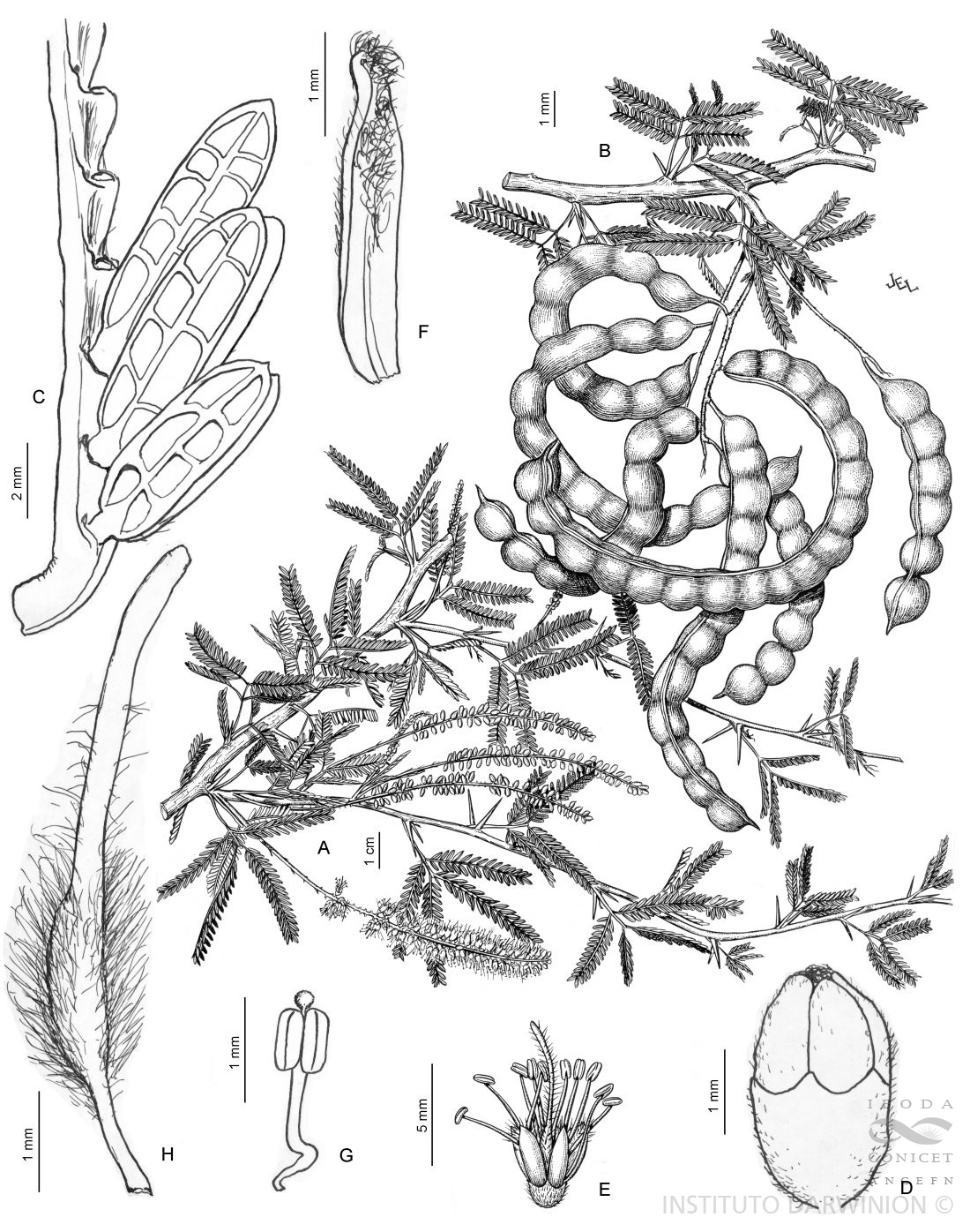 Árbol hasta de 8 m alt., ramas basales algo fastigiadas. Espinas de hasta 2,5 cm. Hojas 1-3-yugadas, pinnas 1-6 cm, 10-30-yugadas; folíolos 2-7,5 x 0,8-1,8 mm. Racimos espiciformes, mayores que las hojas, de 5-13 cm. Legumbres falcadas a anulares, comprimida lateralmente, submoniliforme a moniliforme, de 7-17 cm; epicarpo amarillo pajizo, con manchas violáceas; mesocarpo algo dulce.