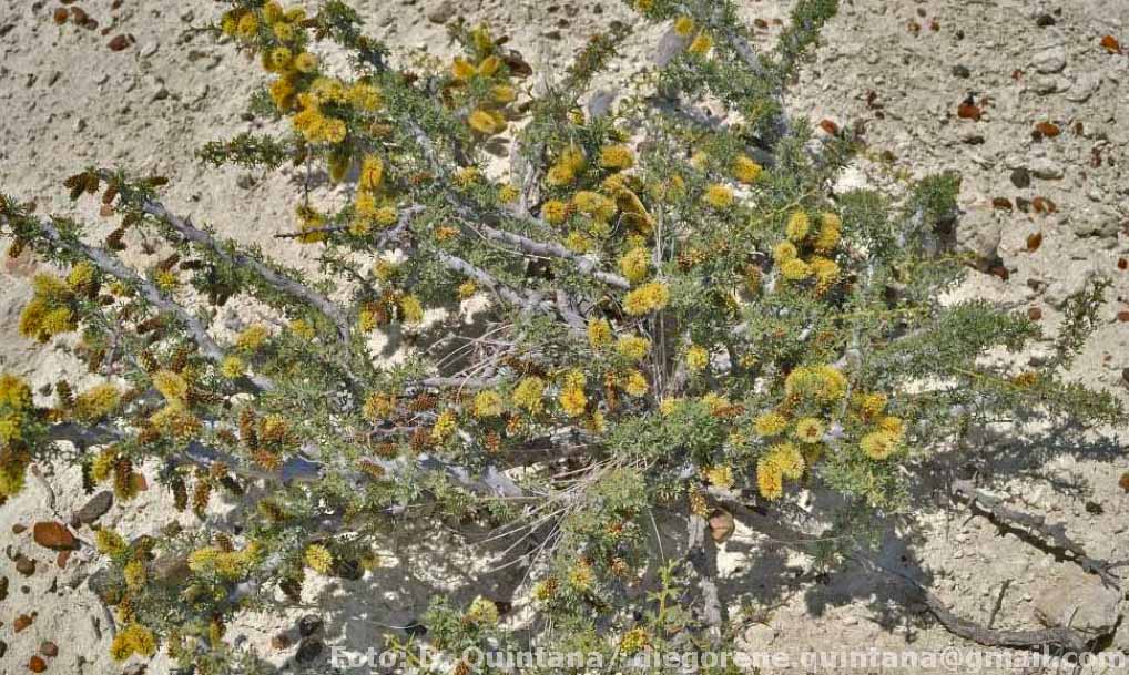 Arbusto de 1-2 m alt., espinoso, glabro, ramitas flexuosas, más bien cortas, duras, grises con la edad; espinas de 0,5-4 cm, axilares, solitarias, duras, castaño claras. Hojas 1-yugadas, glabras, caedizas, pecíolo de 2-15 mm, raquis de 6-8 mm, folíolos de 4-13 mm, lineares, obtusos, en 1-3 (4) pares por pinna, los inferiores alternos. Racimos de 2,5-7 cm, axilares o fasciculados, cortamente pedunculados sobre braquiblastos, flores glabras exteriormente; cáliz de ± 1,5 mm; pétalos de 3 mm, vilosos interiormente. Es-tambres de 5-7 mm. Ovario viloso. Fruto de 2-7 x 0,7-1,4 cm, negro-rojizo brillante cuando maduro, glabro o pubérulo, cortamente estipitado, grueso, subcomprimido-falca-do, con espiras muy abiertas o anular.