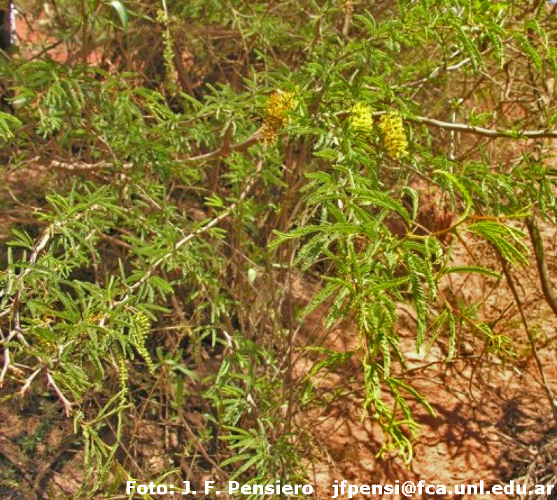 Arbusto de hasta 4 m alt., muy espinoso. Espinas geminadas, robustas, perpendiculares a las ramas soporte y de mayor diámetro que ellas. Hojas 1-2-yugadas, pinnas de 1,5-3,5 cm; pinnas 15-28-yugadas, folíolos 2-6 x 0,7-1,2 mm. Inflorescencias de 2-7 cm, amarillas, raro rojizas. Legumbres rectas, carnosas, pubérulas cuando inmaduras, márgenes ondulados, amarillas con manchas violáceas, de 6-9 cm x 6-8 mm, mesocarpo escaso, ácido, poco palatable.