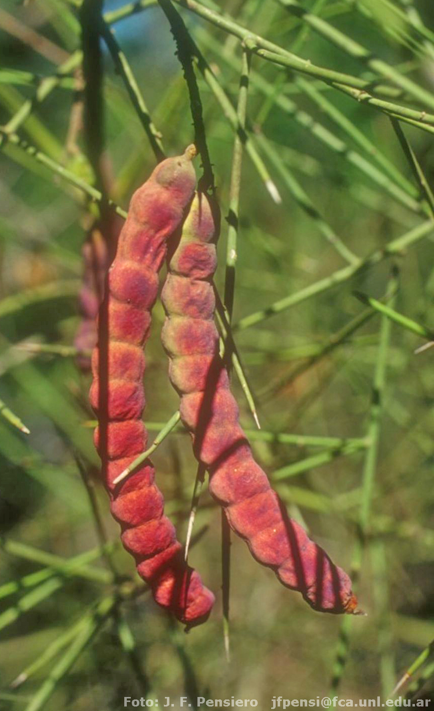 Árbol de hasta 15 m de alt., subáfilo, copa hemiesférica, ramas jóvenes con los ápices espinosos, rectas con entrenudos manifiestos, glabras algo estriadas, verdes, ligeramente glaucas. Hojas efímeras, uniyugadas. Legumbres casi negras a la madurez, lustrosas, rectas a subfalcadas, de 10-17 x 1,5-2,6 cm, epicarpo algo coriáceo; mesocarpo seco, esponjoso, algo dulce, segmentos del endocarpo muy duros. Semillas ovoides, comprimidas, 7-10 x 5-6 mm.