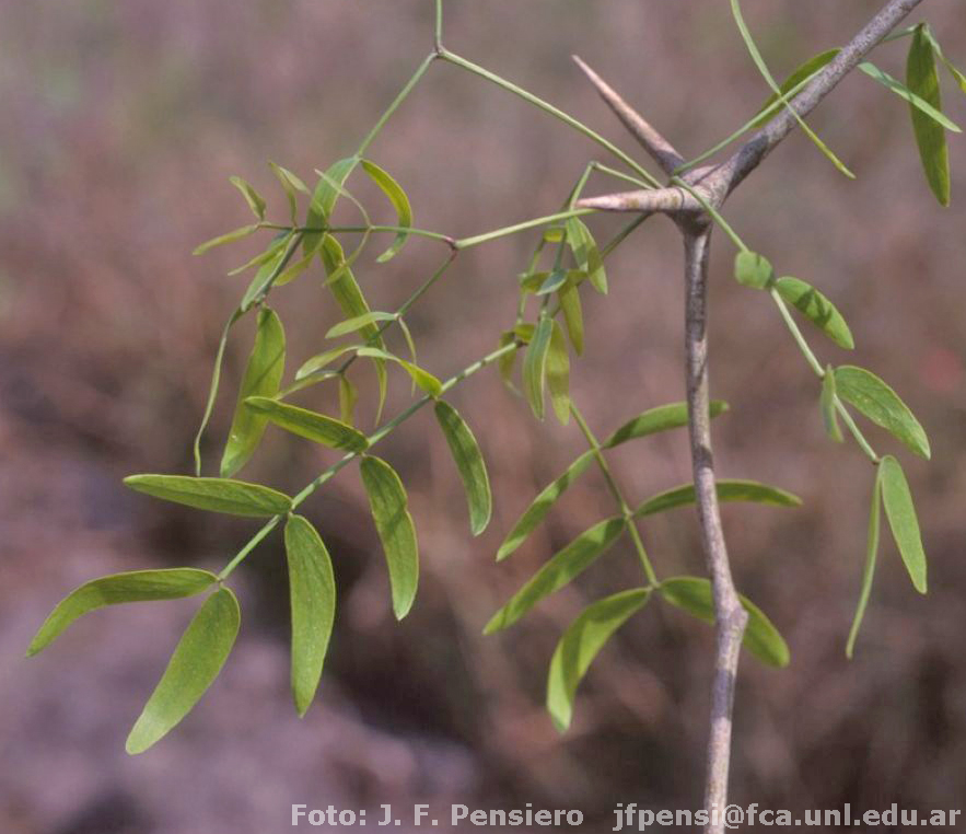 Arbol de 3-10 m alt., tronco 10 a 50 cm diám., ramas flexuosas, con el tiempo nudosas; espinas axilares,robustas alternadamente solitarias o geminadas, 0,5-12 cm long., teniendo en su base 6-8 mm diám., lisas, rollizas, forma de cono alargado, bastante puntiagudas. Hojas uniyugas, grandes, glabras, hasta 25 cm long.; pinas 4 a 12 yugas, variables como asi también el número de folíolos, estos lanceolados u oblongo-lineares, coriáceos, 10-30 mm long. x 2-12 mm lat. Inflorescencia en racimo espiciforme, 6-8 cm long. Flores pequeñas, pedicelos 0,6-1,5 mm long.. Legumbre delgada, subfalcada, subtorulosa, multiarticulada, 6-24 cm long., 6-12 mm lat. x 3-8 mm espesor, epicarpio salpicado con manchas violetas, segmentos del endocarpio duros, comprimidos, subcuadrados con septos oblicuos-tranversos; mesocarpio pulposo, dulce. Semillas comprimidas aovadas a casi ovadas, 5-7 mm long., 3-4 mm lat. x 1,5-2 mm espesor, lisas lustrosas, color castaño claro.