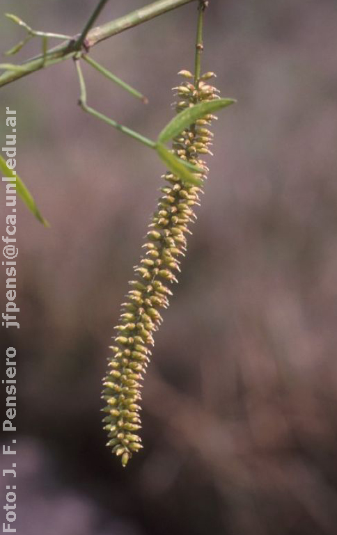 Arbol de 3-10 m alt., tronco 10 a 50 cm diám., ramas flexuosas, con el tiempo nudosas; espinas axilares,robustas alternadamente solitarias o geminadas, 0,5-12 cm long., teniendo en su base 6-8 mm diám., lisas, rollizas, forma de cono alargado, bastante puntiagudas. Hojas uniyugas, grandes, glabras, hasta 25 cm long.; pinas 4 a 12 yugas, variables como asi también el número de folíolos, estos lanceolados u oblongo-lineares, coriáceos, 10-30 mm long. x 2-12 mm lat. Inflorescencia en racimo espiciforme, 6-8 cm long. Flores pequeñas, pedicelos 0,6-1,5 mm long.. Legumbre delgada, subfalcada, subtorulosa, multiarticulada, 6-24 cm long., 6-12 mm lat. x 3-8 mm espesor, epicarpio salpicado con manchas violetas, segmentos del endocarpio duros, comprimidos, subcuadrados con septos oblicuos-tranversos; mesocarpio pulposo, dulce. Semillas comprimidas aovadas a casi ovadas, 5-7 mm long., 3-4 mm lat. x 1,5-2 mm espesor, lisas lustrosas, color castaño claro.