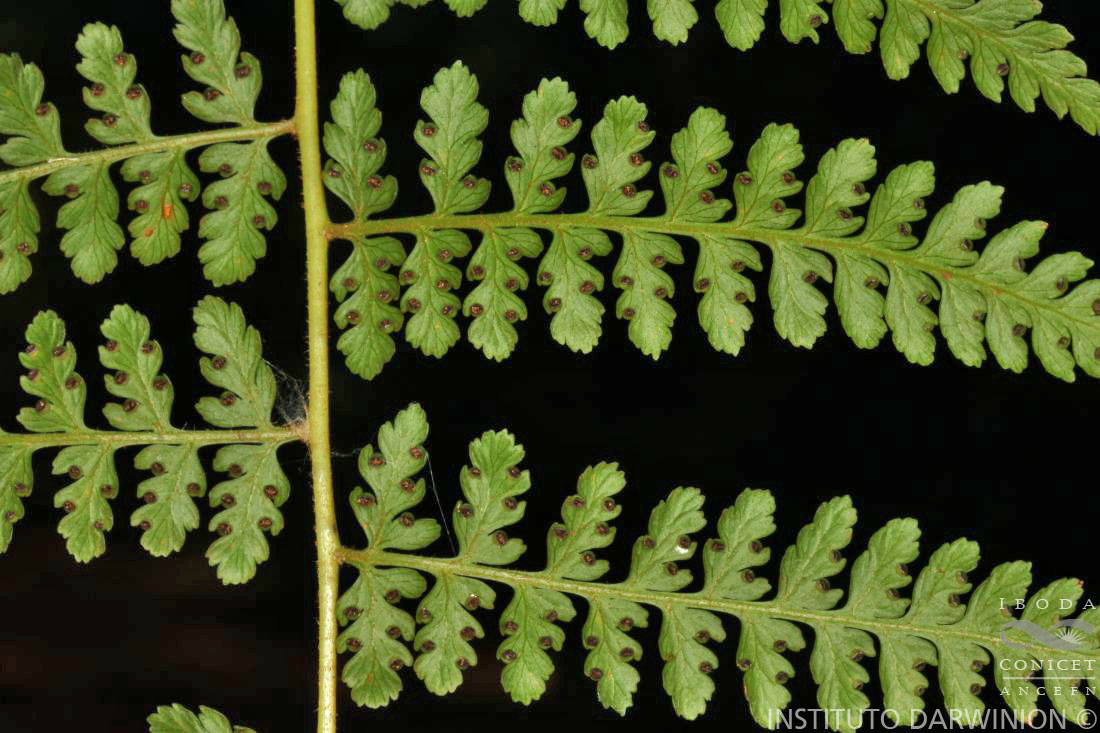 Rizomas largamente rastreros o subterráneos, de 0,5-1 cm de diámetro, densamente pubescente, con tricomas catenados, castaño-dorados; raíces ventrales. Frondes ovado-lanceoladas, de 1-3,4 m de largo; pecíolos de 0,5-1 m de largo, sulcados adaxialmente, pajizos, proximalmente con tricomas catenados, castaños, ascendentes, glabros en porciones media y distal; láminas de 1-2,5 m de largo, 3-pinnadas en el tercio inferior, 2- pinnado-pinnatífidas en el tercio superior; raquis sulcados adaxialmente, surcos pubescentes con tricomas, glabros abaxialmente; raquis secundarios sulcados, con abundantes tricomas catenados en las porciones lateral y abaxial; pinnas 10- 23 pares, alternas, elípticas o lanceoladas, de 1,2-58 × 0,3-24 cm; pínnulas pecioluladas, lanceoladas, de 0,5-20 × 0,3-6 cm; cóstula adaxial bordeada a cada lado por un ala herbácea; el ala del lado basiscópico decurrente en el eje del siguiente orden de división; segmentos oblongos, crenados, pinnatífidos en las pínnulas basales, glabros abaxialmente, con tricomas catenados, castaños sobre las venas; el ápice de las venas estériles adaxiales, delgado. Soros redondeados, de 1-2 mm de diámetro, naciendo en el seno entre lóbulos de los segmentos acroscópicos; indusios globosos, algo más largos que anchos, membranáceos, con forma de copa o bolso. Esporas triletes, tetraédricas, de 17-27 × 21-34 µm, planohemisfericas en vista ecuatorial, castañas al microscopio óptico, verrugado-lomadas, con lomos anchos, fusionados en retículos.