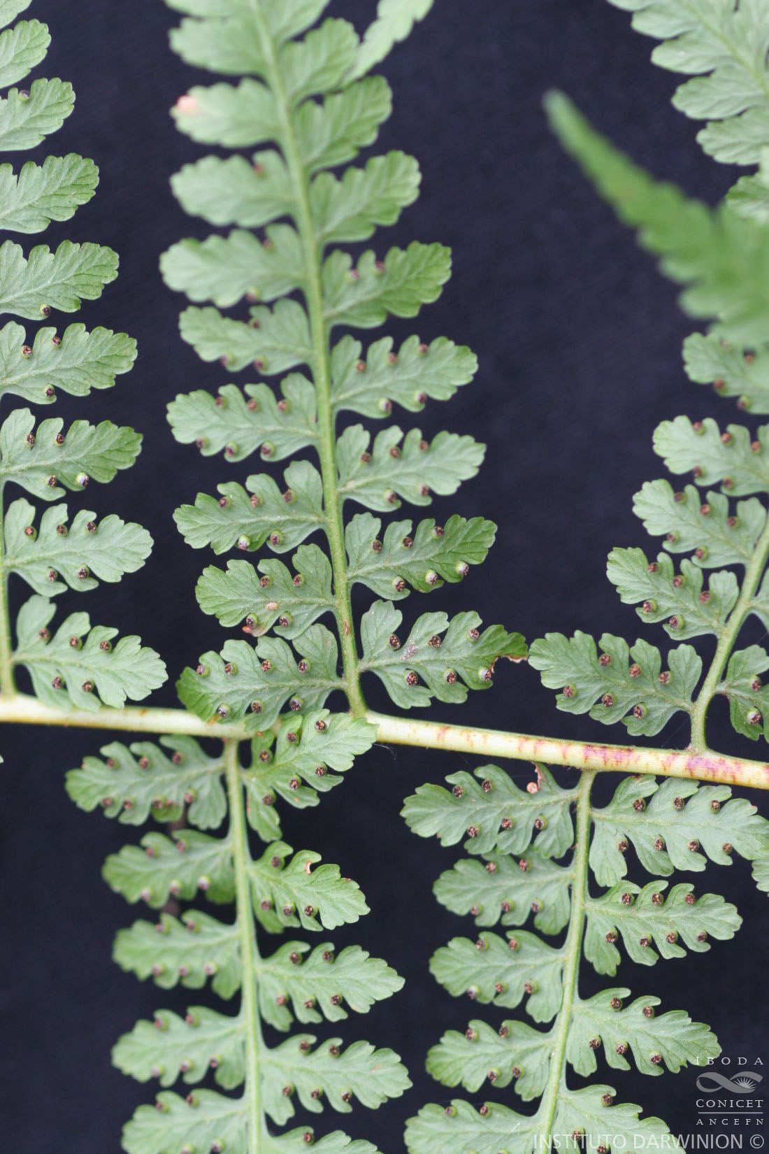 Rizomas largamente rastreros o subterráneos, de 0,5-1 cm de diámetro, densamente pubescente, con tricomas catenados, castaño-dorados; raíces ventrales. Frondes ovado-lanceoladas, de 1-3,4 m de largo; pecíolos de 0,5-1 m de largo, sulcados adaxialmente, pajizos, proximalmente con tricomas catenados, castaños, ascendentes, glabros en porciones media y distal; láminas de 1-2,5 m de largo, 3-pinnadas en el tercio inferior, 2- pinnado-pinnatífidas en el tercio superior; raquis sulcados adaxialmente, surcos pubescentes con tricomas, glabros abaxialmente; raquis secundarios sulcados, con abundantes tricomas catenados en las porciones lateral y abaxial; pinnas 10- 23 pares, alternas, elípticas o lanceoladas, de 1,2-58 × 0,3-24 cm; pínnulas pecioluladas, lanceoladas, de 0,5-20 × 0,3-6 cm; cóstula adaxial bordeada a cada lado por un ala herbácea; el ala del lado basiscópico decurrente en el eje del siguiente orden de división; segmentos oblongos, crenados, pinnatífidos en las pínnulas basales, glabros abaxialmente, con tricomas catenados, castaños sobre las venas; el ápice de las venas estériles adaxiales, delgado. Soros redondeados, de 1-2 mm de diámetro, naciendo en el seno entre lóbulos de los segmentos acroscópicos; indusios globosos, algo más largos que anchos, membranáceos, con forma de copa o bolso. Esporas triletes, tetraédricas, de 17-27 × 21-34 µm, planohemisfericas en vista ecuatorial, castañas al microscopio óptico, verrugado-lomadas, con lomos anchos, fusionados en retículos.