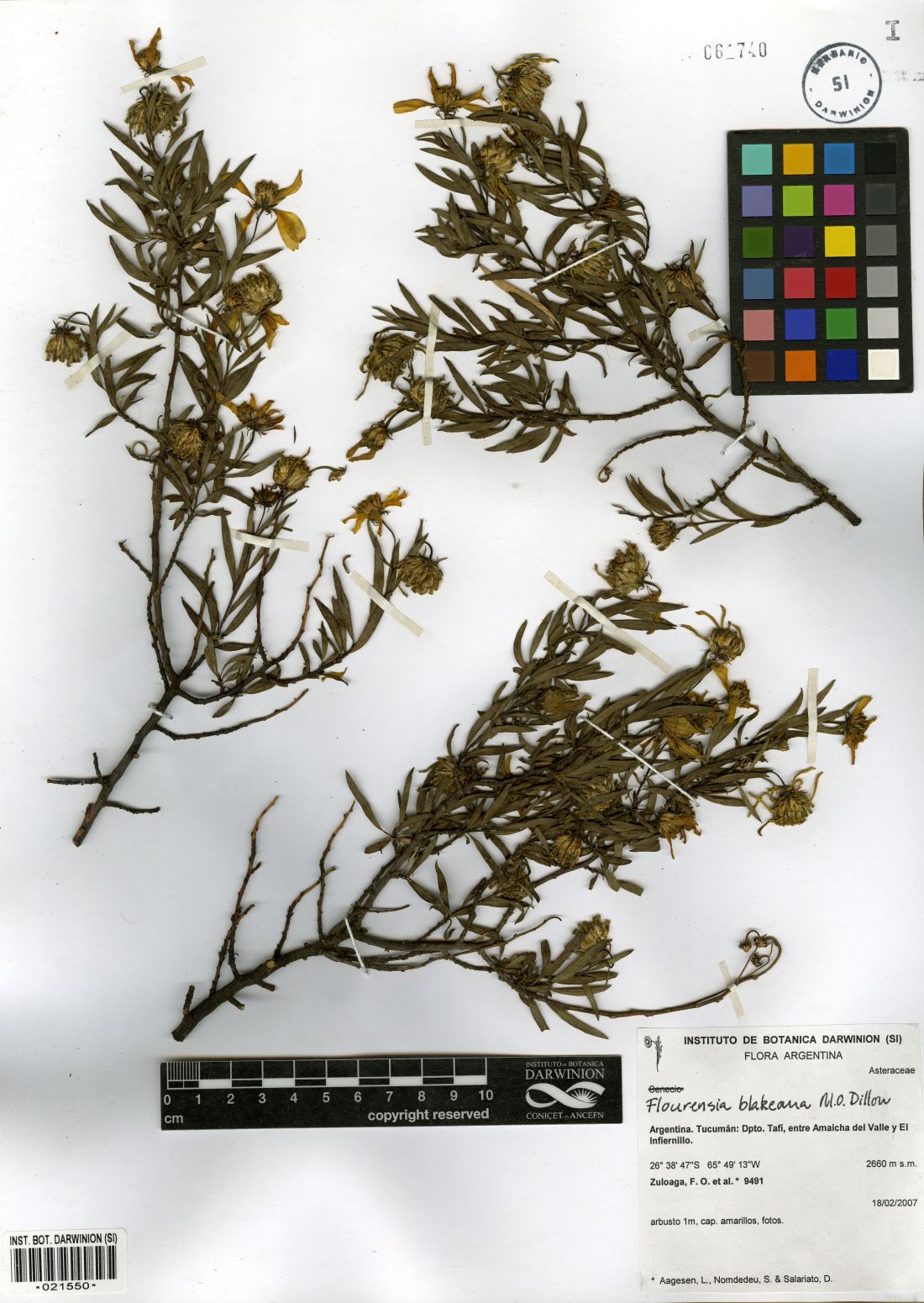 Arbustos hasta de 1 m de alto; tallos decumbentes o ascendentes, hojosos, puberulentos. Hojas brevemente pecioladas (pecíolos de 1,5-6 mm de largo); láminas lanceoladas a oblanceoladas, de 3-6(-8) × 0,5-1,5(-2) cm, atenuadas hacia base, agudas en el ápice, margen entero, algo híspidas, sobre todo en los bordes, o glabrescentes en ambas caras. Capítulos solitarios o dispuestos en cimas de 2-4, sobre pedúnculos pilosos de 1-5 cm de largo. Involucro acampanado, ca. 5 × 6 mm; filarios 2-3-seriados, subiguales, de 4-6(-8) × 1-2 mm, híspidos a glabrescentes, los externos linear- a ovado-lanceolados, los internos rómbico-ovados. Receptáculo con páleas oblanceoladas, de 6-8 mm de largo, glabras a hirsutas, margen hialino. Flores del margen 7-10, con corola amarilla, ligulada, tubo seríceo de 3-4 mm de largo y lígula oblongoovalada, de 7-16 × 5-8 mm; flores del centro 10-15(-25), perfectas, con corola tubulosa, de 3-4 mm de largo, glabra. Aquenios obcónicos, de 4-6 mm de largo, algo comprimidos, seríceos. Papus formado por 2 aristas, de 2-2,5 mm de largo, persistentes.