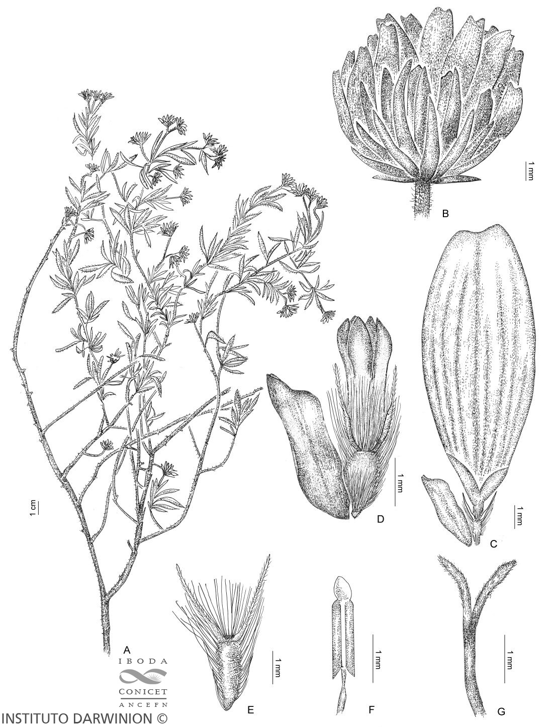 Arbustos hasta de 1 m de alto; tallos decumbentes o ascendentes, hojosos, puberulentos. Hojas brevemente pecioladas (pecíolos de 1,5-6 mm de largo); láminas lanceoladas a oblanceoladas, de 3-6(-8) × 0,5-1,5(-2) cm, atenuadas hacia base, agudas en el ápice, margen entero, algo híspidas, sobre todo en los bordes, o glabrescentes en ambas caras. Capítulos solitarios o dispuestos en cimas de 2-4, sobre pedúnculos pilosos de 1-5 cm de largo. Involucro acampanado, ca. 5 × 6 mm; filarios 2-3-seriados, subiguales, de 4-6(-8) × 1-2 mm, híspidos a glabrescentes, los externos linear- a ovado-lanceolados, los internos rómbico-ovados. Receptáculo con páleas oblanceoladas, de 6-8 mm de largo, glabras a hirsutas, margen hialino. Flores del margen 7-10, con corola amarilla, ligulada, tubo seríceo de 3-4 mm de largo y lígula oblongoovalada, de 7-16 × 5-8 mm; flores del centro 10-15(-25), perfectas, con corola tubulosa, de 3-4 mm de largo, glabra. Aquenios obcónicos, de 4-6 mm de largo, algo comprimidos, seríceos. Papus formado por 2 aristas, de 2-2,5 mm de largo, persistentes.
