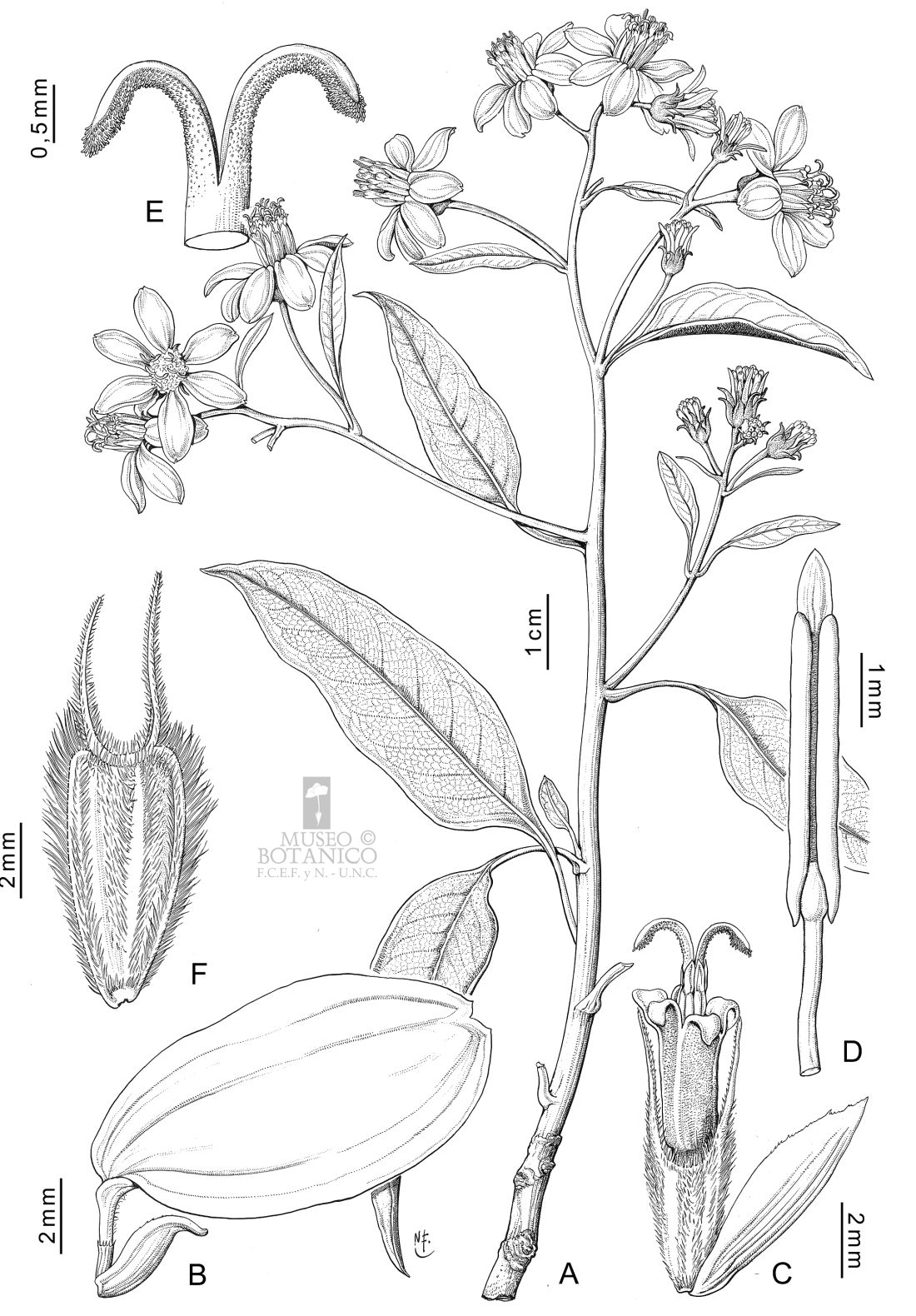 Arbustos hasta de 3 m de alto; tallos ascendentes. Hojas con pecíolos de 5-10 mm de largo y láminas elípticas a elípticolanceoladas, de 5,5-8,5 × 2-3 cm, aguadass hacia la base y el ápice, margen con 2-3 pares de dientes en la porción apical. Capítulos solitarios o en cimas paucicéfalas (de 2-3 capítulos), sobre pedúnculos bracteados de 4-6 cm de largo. Involucro hemisférico, ca. 12 × 9 mm; filarios 3-4-seriados, imbricados, de 5-6 × 2,5-4 mm, subherbáceos, los externos ovados, los internos gradualmente oblongos. Receptáculo con páleas oblanceoladas, ca. 7 mm de largo. Flores del margen 12-16, corola ligulada, con tubo seríceo, de 4-5 mm de largo y lígula oblonga, de 12-28 × 3-8 mm; flores del centro ca. 50, corola tubulosa ca 5-6 mm de largo. Aquenios obcónicos, de 5-8 mm de largo, seríceos. Papus formado por 2 aristas, de 4-5 mm de largo, a menudo unidas a una corona lacerada y persistente.