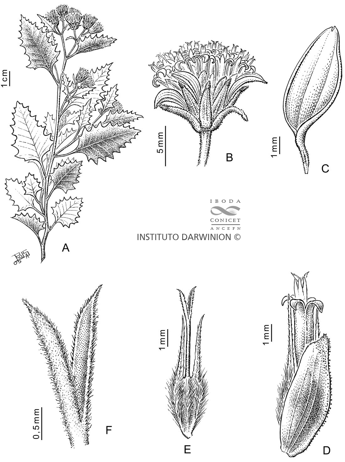 A. Rama florífera. B. Capítulo. C. Flor del margen. D. Flor del centro con la pálea. E. Aquenio con el papus y el estilo. F. Parte superior del estilo