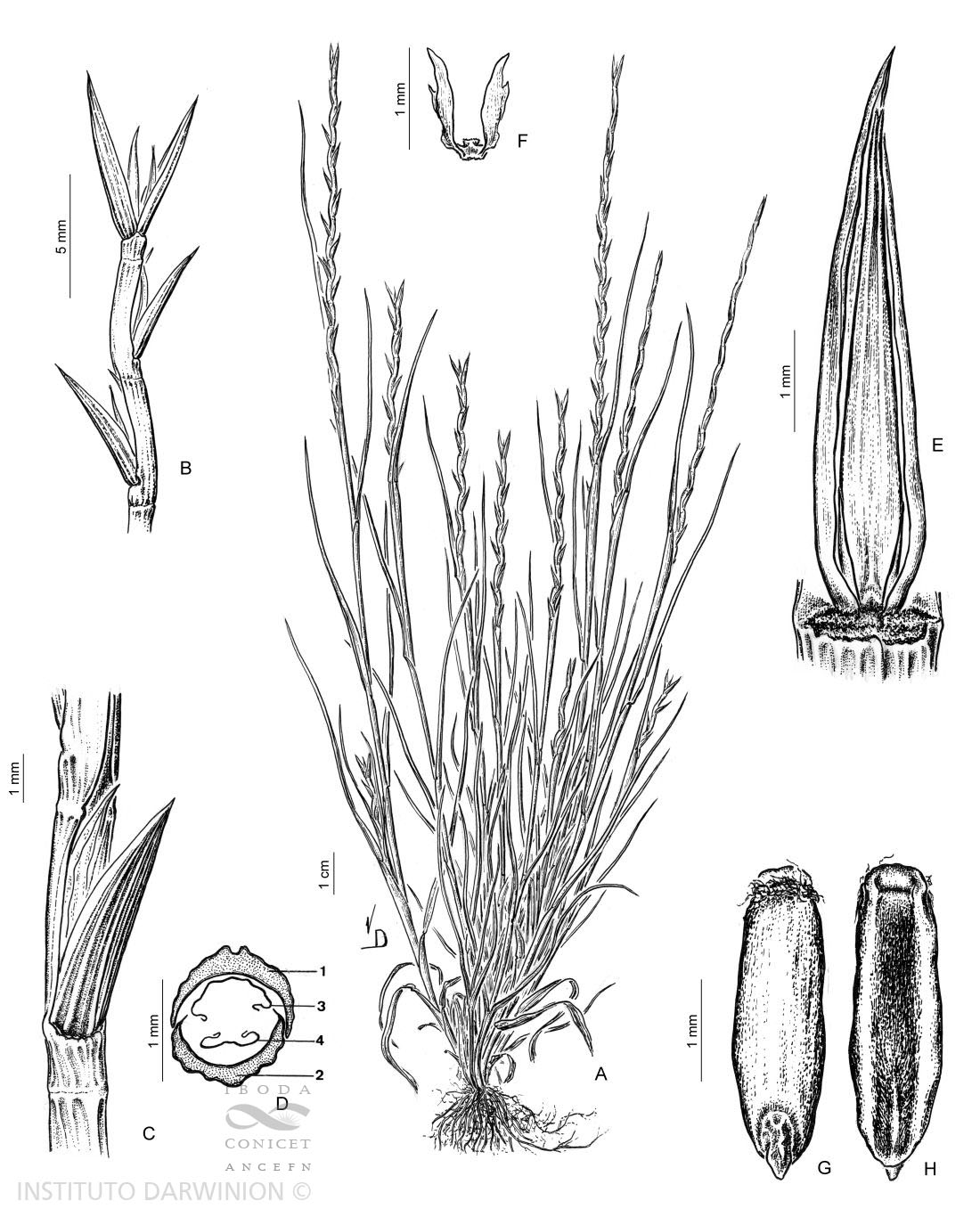 A. Planta. B. Ápice de la inflorescencia mostrando la espiguilla terminal con 2 glumas y dos espiguillas inferiores con una gluma. Espiguilla con un fragmento del raquis. D. Corte transversal de una espiguilla y del raquis, 1) raquis, 2) gluma, 3) lemma, 4) pálea. E. Antecio, vista ventral. F. Lodículas. G. Cariopsis, vista escutelar. H. Cariopsis, vista hilar.