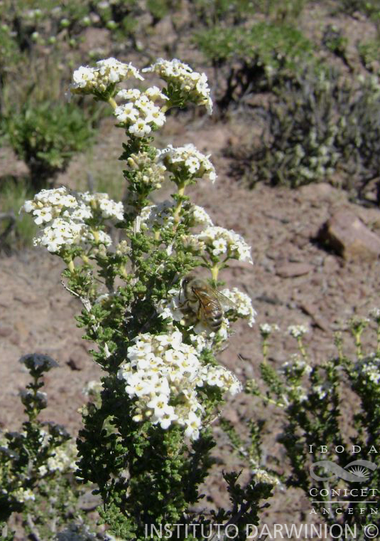 Arbustos aromáticos de 30-100 cm de alto, algo postrados en la base, con ramas espinescentes, pubérulo-glandulosas cuando jóvenes, con corteza rugosa que se desprende longitudinalmente en las ramas maduras. Hojas opuestas, muchas veces con fascículos axilares de hojas más pequeñas, sésiles; láminas 3-lobadas, de 2-4,5(-6) x 1,5-2 mm, base atenuada, ápice subobtuso, margen liso notablemente revoluto, subcrasas, pubérulo-glandulosas en la cara abaxial, escabrosas en la adaxial. Sinflorescencia en pleiobotrios homotéticos, formada por espigas axilares solitarias, muchas veces agrupadas hacia el ápice de las ramas por acortamiento de los entrenudos, subglobosas en antesis, elongadas en fructificación, de 1-2 cm de largo; pedúnculos de 0,5 cm de largo, raquis y pedúnculo pubéruloglandulosos. Flores pequeñas, subsésiles; brácteas florales ovadas, de menor longitud que el cáliz, de 2 mm, ápice agudo, con notable nervio medio, pubérulo-glandular en la cara externa, ligeramente pubérula en la interna; cáliz bilobado, de 2,5-3 mm de largo, densamente híspido en la cara externa, con 4 dientes inconspicuos; corola subactinomorfa, blanca, de 5-6 mm de largo, glabra; estambres 4 insertos hacia la mitad del tubo corolino, inclusos, anteras subsésiles, par superior con apéndices glandulares en el conectivo, ligeramente exertos; estilo terminal, estigma apical. Fruto dividido en dos clusas de 2 mm de largo.