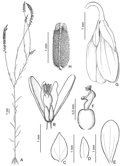 Hierbas erectas, de 10-50 cm de largo; tallos ramificados principalmente en la parte media, glabros. Hojas alternas; pecíolos subnulos; láminas lineares, de 7-20 × 0,3-1,4 mm, ápice agudo, glabras. Inflorescencias en racimos espiciformes, de 1-10 × 0,5 cm; brácteas triangulares, ca. 1 × 0,2 mm, ápice agudo, glabras, caducas en antesis; bractéolas, lineares, ca. 0,2 × 0,05 mm, ápice agudo, glabras, caducas. Flores ca. 2,5 mm de largo; pedicelos ca. 0,4-0,8 mm de largo, glabros; cáliz lila, rosado o raramente blanco; sépalos externos glabros; sépalo externo inferior lanceolado, ca. 0,9 × 0,5 mm, ápice agudo, cóncavo; sépalos externos superiores libres, lanceolados, ca. 0,9 × 0,4 mm, ápice agudo; sépalos internos “alas” elípticos, ca. 2 × 0,9 mm, ápice obtuso, glabros; corola lila, rosada o rara blanca; quilla ca. 0,9-2 mm de largo, cuña ca. 0,6 mm de largo, cresta con 6-8 lóbulos; pétalos laterales elípticos, ca. 1,5 × 0,8 mm, ápice obtuso a veces emarginado, sin manchas violáceas, glabros, fusionados con la vaina estaminal a través de 1/4 de su margen; estambres 8, vaina estaminal ca. 0,9 mm de largo, glabra, porción libre de los fi lamentos estaminales menor que el largo de las anteras, ca. 0,1 mm de largo, anteras poricidas; ovario elipsoide, de 0,8 × 0,5-0,6 mm, simétrico, glabro; estilo curvo en forma de “U”, ca. 0,7 mm de largo, área estigmática con el lóbulo estéril terminado en una borla de tricomas, márgenes glabros, lóbulo fértil sobre un breve soporte. Fruto una cápsula de contorno oblongo, ca. 2 × 1 mm, simétrica, margen no alado, glabra. Semillas cilíndricas, ca. 1,5 × 0,5 mm, pubescentes, rostro poco desarrollado; elaiosomas orbiculares, de hasta 1/8 del largo de la semilla, libres.