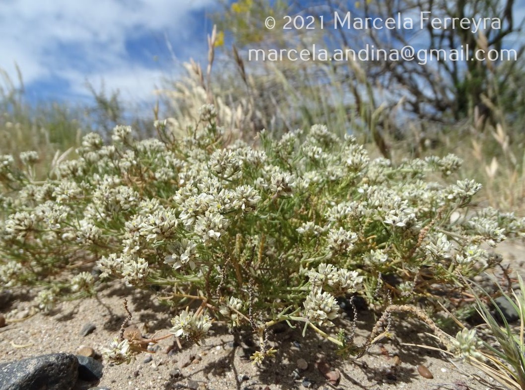 Hierbas erectas a decum bentes, a veces formando matas apoyantes laxas, de 7-50 cm de alto; tallos ramifi cados desde la base o la parte media, pubérulos. Hojas alterno-espiraladas, sésiles; láminas filiformes a lineares, de 5-10 × 0,4-1 mm, ápice apiculado, glabras o pubérulas. Inflorescencias en racimos capituliformes a alargados, de 1-6 × 1-2 cm, congestos; brácteas triangulares, de 1-4,5 × 0,5-0,9 mm, dos o hasta tres veces más largas que las bractéolas, ápice agudo, glabras, caducas o persistentes en la antesis; bractéolas ovadas, de 0,5-1 × 0,5 mm, ápice agudo, glabras, caducas o persistentes. Flores de 3,5-8 mm de largo; pedicelos de 2,2-4 mm de largo, glabros o pubescentes; cáliz blanco con una estría violácea o verdosa-oscura en el medio; sépalos externos glabros; sépalo externo inferior ovado, de 2-2,5 × 1-1,5 mm, ápice agudo; sépalos externos superiores lanceolados, de 3-4 × 1 mm, ápice agudo, libres; sépalos internos “alas” elípticos, de 3,5-4,1 × 1,5-2 mm, ápice agudo, glabros; corola blanca; quilla ca. 3,5 mm de largo, cuña ca. 1 mm de largo, cresta con 8-20 lóbulos; pétalos laterales ovados, ca. 3 × 1,5 mm, ápice obtuso a emarginado, sin manchas violáceas, glabros, pubescentes en la porción media adaxial, fusionados con la vaina estaminal a través de 1/3 de su margen; estambres 8, vaina estaminal ca. 2 mm de largo, glabra, porción libre de los filamentos estaminales menor que el largo de las anteras, ca. 0,1 mm de largo, anteras poricidas; ovario ovoide, de 0,8-1 × 0,5 mm, simétrico, glabro; estilo recto, de 0,8-1,9 mm de largo, ensanchado distalmente, área estigmática con el lóbulo estéril obtuso, pubescente en sus bordes y caras, los márgenes cubriendo parcialmente al lóbulo fértil. Fruto una cápsula suborbicular, de 2-3 × 2-3,5 mm, simétrica o levemente asimétrica, el margen levemente alado, glabra. Semillas globosas, de 1,5-2 × 1-1,5 mm, pubescentes, rostro desarrollado; elaiosomas lineares, de mayor longitud que la semilla, libres.