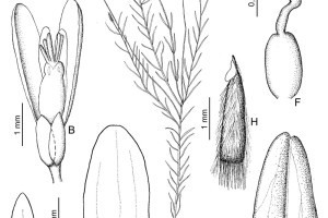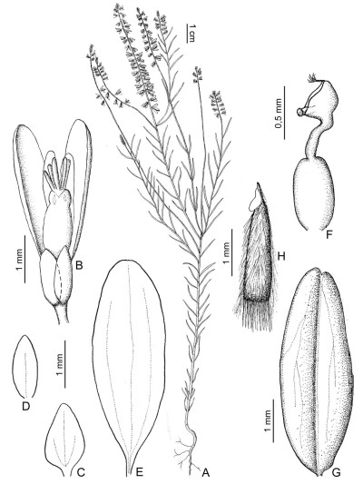 Hierbas erectas, de 20-50 cm de largo; tallos ramificados en la parte media, pubérulos con tricomas cortos. Hojas alternas, en la base subverticiladas y caedizas, sésiles; láminas lineares, de 10-20 × 0,4-1,5 mm, ápice agudo, glándulas presentes o ausentes, glabras o con tricomas escasos. Inflorescencias en racimos espiciformes, laxos, de 1-14 × 0,5 cm; brácteas orbiculares a lanceoladas, de 2-3 × 1,5 mm, ápice agudo, glabras, caducas en la antesis; bractéolas triangulares, de 0,4 × 0,1 mm, ápice agudo, glabras, caducas. Flores de 4-5 mm de largo; pedicelos ca. 1 mm de largo, glabros; cáliz violeta a rosado, raro blanco; sépalos externos glabros; sépalo externo inferior ovado, ca. 1 × 0,5 mm, ápice obtuso, cóncavo; sépalos externos superiores elípticos, ca. 1 × 0,4 mm, ápice obtuso, libres; sépalos internos “alas” elípticos, ca. 3,5-4 × 1,5 mm, ápice obtuso, glabros; corola violeta a rosada, raro blanca; quilla ca. 2,5 mm de largo, cuña ca. 1 mm de largo, cresta con 8-10 lóbulos; pétalos laterales elípticos, ca. 3 × 1 mm, ápice obtuso, fusionados con la vaina estaminal a través de 1/4 de su margen, sin manchas violáceas, glabros; estambres 8, vaina estaminal de 1-1,2 mm de largo, glabra, porción libre de los fi lamentos estaminales mayor que el largo de las anteras, ca. 0,5 mm de largo, anteras poricidas; ovario elipsoide, ca. 1 × 0,5 mm, simétrico, glabro; estilo curvo en forma de “U”, ca. 0,8 mm de largo, área estigmática con el lóbulo estéril terminado en una borla de tricomas escasos, márgenes glabros, lóbulo fértil sobre un breve soporte. Fruto una cápsula elipsoide, de 3-4,7 × 1,5-1,7 mm, simétrica, el margen no alado, con glándulas, glabra. Semillas conoideas, ca. 2,7 × 0,7 mm, pubescentes con una corona de tricomas en la base, rostro desarrollado; elaiosomas elípticos, hasta de 1/6 del largo de la semilla, libres.