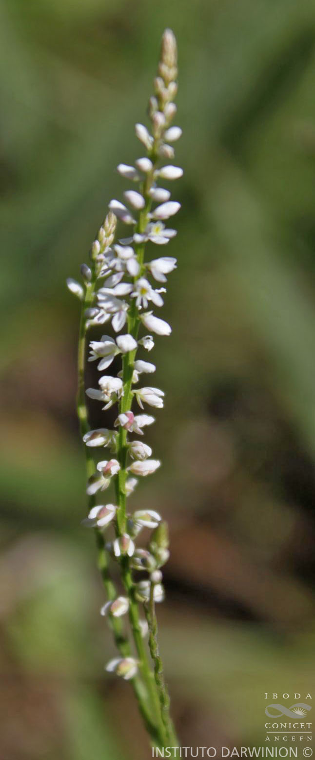 Hierbas erectas a decumbentes, de 10-35 cm de largo; tallos ramificados, pubérulos o pubescentes. Hojas alternas, sésiles; láminas cordiformes o linear-lanceoladas, de 6-10 × 0,2-2,3 mm, ápice agudo, todas o algunas amplexicaules, pubérulas o pubescentes. Inflorescencias en racimos espiciformes, de 1-5 × 0,5 cm; brácteas lanceoladas, de 1,1-1,5 × 0,5 mm, ápice agudo, ciliadas, caducas en la antesis; bractéolas lanceoladas, ca. 0,5 × 0,2 mm, ápice agudo, glabras, caducas. Flores de 2-3 mm de largo; pedicelos ca. 0,5 mm de largo, glabros; cáliz blanco o lila; sépalos externos glabros; sépalo externo inferior ovado, de 1-1,8 × 0,7 mm, ápice obtuso o agudo; sépalos externos superiores elípticos, ca. 1-1,5 × 0,6 mm, ápice agudo, libres; sépalos internos “alas” orbiculares, ca. 2 × 1,1 mm, ápice obtuso, glabros; corola blanca o lila; quilla de 2-2,3 mm de largo, cuña ca. 0,6 mm de largo, cresta con 6-8 lóbulos; pétalos laterales elípticos, de 2-2,5 × 1-1,4 mm, ápice obtuso, fusionados con la vaina estaminal a través de 1/5 de su margen, sin manchas violáceas, glabros; estambres 8, vaina estaminal ca. 1 mm de largo, glabra, porción libre de los fi lamentos estaminales mayor que el largo de las anteras, ca. 0,4 mm de largo, anteras poricidas; ovario ovoide a cordiforme, de 0,8 × 0,8-0,9 mm, simétrico, glabro; estilo curvo en forma de “U”, de 0,8-1 mm de largo, área estigmática con el lóbulo estéril terminado en un mechón de tricomas escasos, márgenes glabros, lóbulo fértil sobre un breve soporte. Fruto una cápsula orbicular, de 1,5-1,8 × 1,8-2 mm, simétrica o levemente asimétrica, el margen no alado o muy levemente alado, glabras. Semillas elipsoides, ca. 1 × 0,5 mm, glabras, escrobiculadas, rostro poco desarrollado; elaiosomas elípticos, 1/2 hasta más largos que el largo total de la semilla, libres.