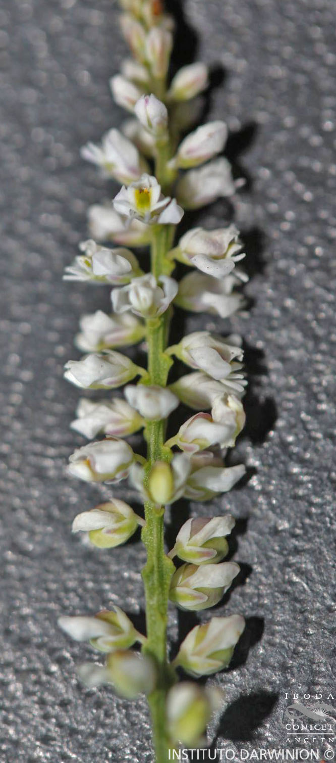 Hierbas erectas a decumbentes, de 10-35 cm de largo; tallos ramificados, pubérulos o pubescentes. Hojas alternas, sésiles; láminas cordiformes o linear-lanceoladas, de 6-10 × 0,2-2,3 mm, ápice agudo, todas o algunas amplexicaules, pubérulas o pubescentes. Inflorescencias en racimos espiciformes, de 1-5 × 0,5 cm; brácteas lanceoladas, de 1,1-1,5 × 0,5 mm, ápice agudo, ciliadas, caducas en la antesis; bractéolas lanceoladas, ca. 0,5 × 0,2 mm, ápice agudo, glabras, caducas. Flores de 2-3 mm de largo; pedicelos ca. 0,5 mm de largo, glabros; cáliz blanco o lila; sépalos externos glabros; sépalo externo inferior ovado, de 1-1,8 × 0,7 mm, ápice obtuso o agudo; sépalos externos superiores elípticos, ca. 1-1,5 × 0,6 mm, ápice agudo, libres; sépalos internos “alas” orbiculares, ca. 2 × 1,1 mm, ápice obtuso, glabros; corola blanca o lila; quilla de 2-2,3 mm de largo, cuña ca. 0,6 mm de largo, cresta con 6-8 lóbulos; pétalos laterales elípticos, de 2-2,5 × 1-1,4 mm, ápice obtuso, fusionados con la vaina estaminal a través de 1/5 de su margen, sin manchas violáceas, glabros; estambres 8, vaina estaminal ca. 1 mm de largo, glabra, porción libre de los fi lamentos estaminales mayor que el largo de las anteras, ca. 0,4 mm de largo, anteras poricidas; ovario ovoide a cordiforme, de 0,8 × 0,8-0,9 mm, simétrico, glabro; estilo curvo en forma de “U”, de 0,8-1 mm de largo, área estigmática con el lóbulo estéril terminado en un mechón de tricomas escasos, márgenes glabros, lóbulo fértil sobre un breve soporte. Fruto una cápsula orbicular, de 1,5-1,8 × 1,8-2 mm, simétrica o levemente asimétrica, el margen no alado o muy levemente alado, glabras. Semillas elipsoides, ca. 1 × 0,5 mm, glabras, escrobiculadas, rostro poco desarrollado; elaiosomas elípticos, 1/2 hasta más largos que el largo total de la semilla, libres.