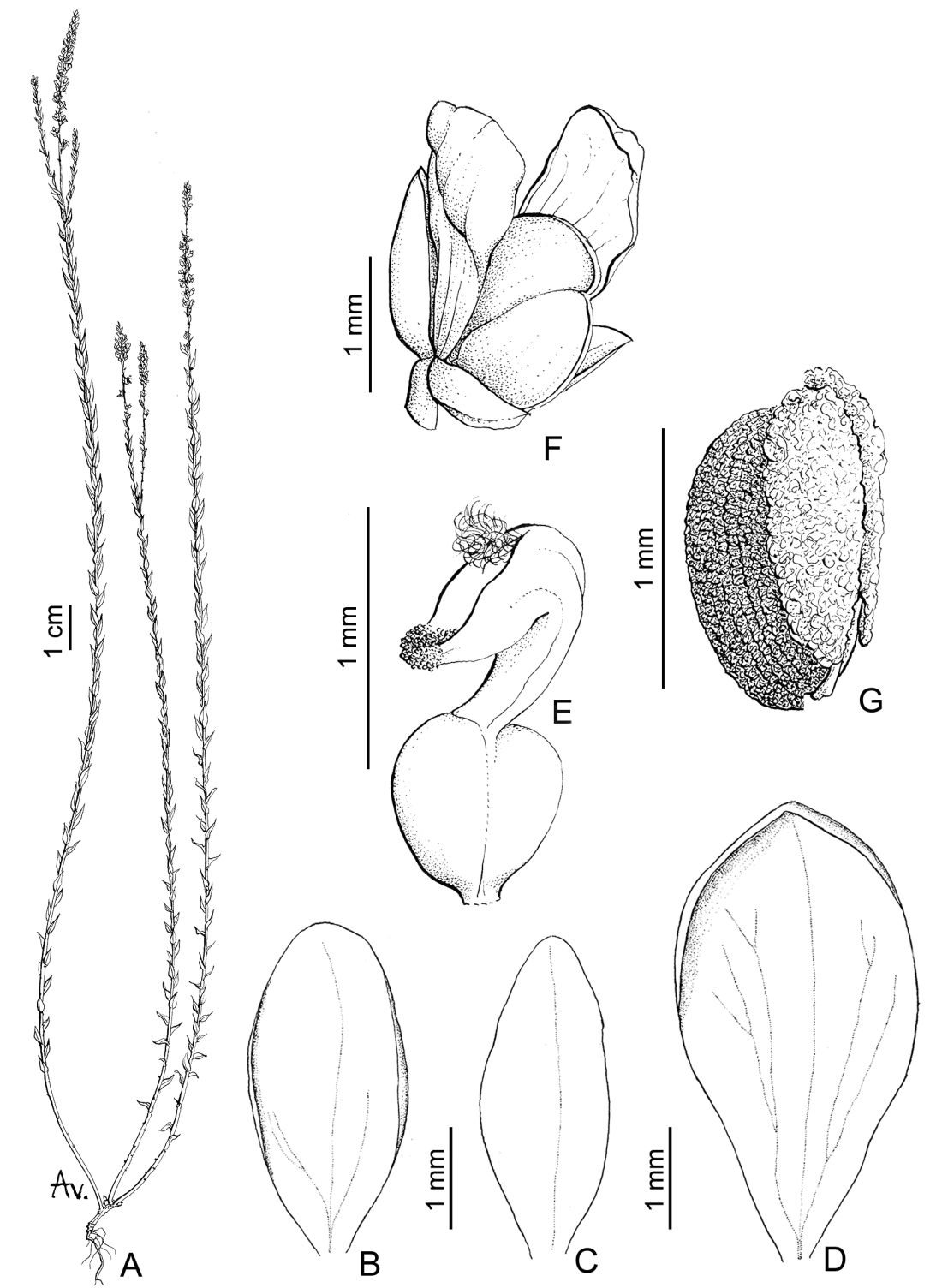 Hierbas erectas a decumbentes, de 10-35 cm de largo; tallos ramificados, pubérulos o pubescentes. Hojas alternas, sésiles; láminas cordiformes o linear-lanceoladas, de 6-10 × 0,2-2,3 mm, ápice agudo, todas o algunas amplexicaules, pubérulas o pubescentes. Inflorescencias en racimos espiciformes, de 1-5 × 0,5 cm; brácteas lanceoladas, de 1,1-1,5 × 0,5 mm, ápice agudo, ciliadas, caducas en la antesis; bractéolas lanceoladas, ca. 0,5 × 0,2 mm, ápice agudo, glabras, caducas. Flores de 2-3 mm de largo; pedicelos ca. 0,5 mm de largo, glabros; cáliz blanco o lila; sépalos externos glabros; sépalo externo inferior ovado, de 1-1,8 × 0,7 mm, ápice obtuso o agudo; sépalos externos superiores elípticos, ca. 1-1,5 × 0,6 mm, ápice agudo, libres; sépalos internos “alas” orbiculares, ca. 2 × 1,1 mm, ápice obtuso, glabros; corola blanca o lila; quilla de 2-2,3 mm de largo, cuña ca. 0,6 mm de largo, cresta con 6-8 lóbulos; pétalos laterales elípticos, de 2-2,5 × 1-1,4 mm, ápice obtuso, fusionados con la vaina estaminal a través de 1/5 de su margen, sin manchas violáceas, glabros; estambres 8, vaina estaminal ca. 1 mm de largo, glabra, porción libre de los fi lamentos estaminales mayor que el largo de las anteras, ca. 0,4 mm de largo, anteras poricidas; ovario ovoide a cordiforme, de 0,8 × 0,8-0,9 mm, simétrico, glabro; estilo curvo en forma de “U”, de 0,8-1 mm de largo, área estigmática con el lóbulo estéril terminado en un mechón de tricomas escasos, márgenes glabros, lóbulo fértil sobre un breve soporte. Fruto una cápsula orbicular, de 1,5-1,8 × 1,8-2 mm, simétrica o levemente asimétrica, el margen no alado o muy levemente alado, glabras. Semillas elipsoides, ca. 1 × 0,5 mm, glabras, escrobiculadas, rostro poco desarrollado; elaiosomas elípticos, 1/2 hasta más largos que el largo total de la semilla, libres.