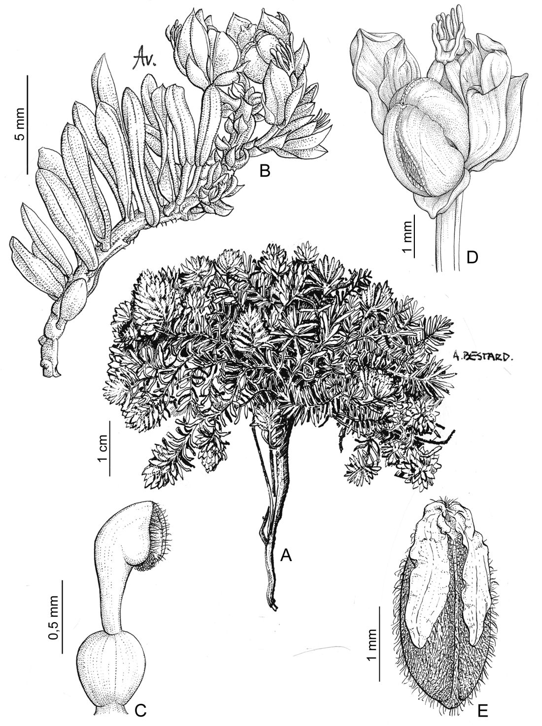 Hierbas postradas, generalmente formando matas compactas, de 3-10 cm de largo; tallos ramificados desde la base, pubérulos. Hojas alternas, sésiles; láminas espatuladas a lineares, de 3-8 × 1 mm, ápice obtuso, glabras. Inflorescencias en racimos capituliformes, congestos, ca. 1 × 1 cm; brácteas elípticas, ca. 1 × 0,8 mm, ápice agudo u obtuso, glabras, persistentes; bractéolas lanceoladas, de 0,5-1 × 0,5 mm, ápice agudo, glabras, persistentes. Flores ca. 5 mm de largo; pedicelos de 1,5-2 mm de largo, glabros; cáliz blanco con una estría verdosa-oscura en el medio; sépalos externos glabros; sépalo externo inferior ovado, ca. 1,5 × 1 mm, ápice agudo; sépalos externos superiores lanceolados, ca. 2 × 0,8 mm, ápice agudo, glabros, libres; sépalos internos “alas” elípticos, de 3-3,5 × 1,5-2 mm, ápice agudo, glabros; corola blanca; quilla de 2,5-3,5 mm de largo, cuña ca. 1 mm de largo, cresta con 8-14 lóbulos; pétalos laterales oblongos, de 3 × 1-1,3 mm, ápice obtuso a emarginado, fusionados con la vaina estaminal a través de 1/4 de su margen, manchas no reportadas, glabros, a veces levemente pubescentes en la porción media adaxial; estambres 8, vaina estaminal ca. 1,5 mm de largo, glabra, porción libre de los filamentos estaminales menor o igual que el largo de las anteras, ca. 0,2 mm de largo, anteras poricidas; ovario ovoide, ca. 0,8 × 0,5 mm, simétrico, glabro; estilo levemente geniculado, de 1-1,4 mm de largo, ensanchado distalmente, área estigmática con el lóbulo estéril obtuso, ciliado, los márgenes cubriendo parcialmente al lóbulo fértil. Fruto una cápsula suborbicular, de 2-2,5 × 2,5 mm, levemente asimétrica, el margen levemente alado, glabra. Semillas elipsoides, de 2-2,5 × 1 mm, pubescentes, rostro poco desarrollado; elaiosomas libres, irregulares, hasta 3/4 del largo de la semilla.