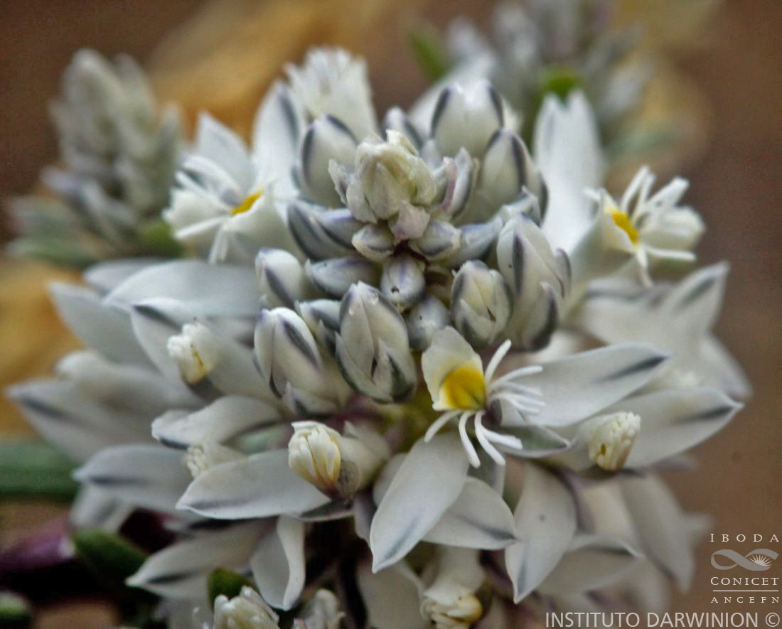 Hierbas erectas a decumbentes, formando matas laxas, de 10-45 cm de alto; tallos ramificados desde la base o hacia la parte media, glabros. Hojas alterno-espiraladas, sésiles; láminas oblongas a lineares, de 5-15 × 0,5-2 mm, ápice apiculado, carnosas, glabras, raro pubérulas. Inflorescencias en racimos capituliformes, de 1,1-2 × 0,9-1,3 cm, congestos; brácteas triangulares, ca. 3 × 1 mm, hasta 3 veces más largas que las bractéolas, ápice agudo, glabras, caducas o raro persistentes en la antesis; bractéolas ovadas, de 1 × 0,5 mm, ápice agudo, glabras, caducas. Flores de 7-8,5 mm de largo; pedicelos ca. 3 mm de largo, glabros; cáliz blanco con una estría violácea-oscura en el medio; sépalos externos glabros; sépalo externo inferior ovado, ca. 2,5 × 1,5 mm, ápice agudo; sépalos externos superiores lanceolados, ca. 3,5 × 1 mm, ápice agudo, libres; sépalos internos “alas” elípticos, ca. 4 × 2 mm, ápice agudo, glabros; corola blanca; quilla ca. 4 mm de largo, cuña ca. 1 mm de largo, cresta con 10-20 lóbulos; pétalos laterales ovados, de 3-4 × 1-1,5 mm, ápice obtuso, fusionados con la vaina estaminal a través de 1/3 de su margen, sin manchas violáceas, glabros, a veces pubescentes en la porción media adaxial; estambres 8, vaina estaminal ca. 2 mm de largo, glabra, porción libre de los filamentos estaminales menor que el largo de las anteras, ca. 0,1 mm de largo, anteras poricidas; ovario ovoide, de 1 × 0,7 mm, simétrico, glabro; estilo recto, de 1-2 mm de largo, ensanchado distalmente, área estigmática con el lóbulo estéril obtuso, pubescente en sus bordes y caras, márgenes parcialmente cubriendo al lóbulo fértil. Fruto una cápsula suborbicular, ca. 2,5 × 3 mm, simétrica, el margen levemente alado, glabra. Semillas globosas, ca. 1,5 × 1 mm, pubescentes, rostro desarrollado; elaiosomas lineares, de mayor longitud que la semilla, libres.