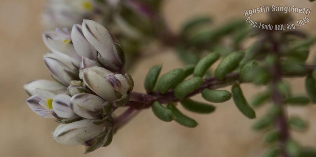 Hierbas erectas a decumbentes, formando matas laxas, de 10-45 cm de alto; tallos ramificados desde la base o hacia la parte media, glabros. Hojas alterno-espiraladas, sésiles; láminas oblongas a lineares, de 5-15 × 0,5-2 mm, ápice apiculado, carnosas, glabras, raro pubérulas. Inflorescencias en racimos capituliformes, de 1,1-2 × 0,9-1,3 cm, congestos; brácteas triangulares, ca. 3 × 1 mm, hasta 3 veces más largas que las bractéolas, ápice agudo, glabras, caducas o raro persistentes en la antesis; bractéolas ovadas, de 1 × 0,5 mm, ápice agudo, glabras, caducas. Flores de 7-8,5 mm de largo; pedicelos ca. 3 mm de largo, glabros; cáliz blanco con una estría violácea-oscura en el medio; sépalos externos glabros; sépalo externo inferior ovado, ca. 2,5 × 1,5 mm, ápice agudo; sépalos externos superiores lanceolados, ca. 3,5 × 1 mm, ápice agudo, libres; sépalos internos “alas” elípticos, ca. 4 × 2 mm, ápice agudo, glabros; corola blanca; quilla ca. 4 mm de largo, cuña ca. 1 mm de largo, cresta con 10-20 lóbulos; pétalos laterales ovados, de 3-4 × 1-1,5 mm, ápice obtuso, fusionados con la vaina estaminal a través de 1/3 de su margen, sin manchas violáceas, glabros, a veces pubescentes en la porción media adaxial; estambres 8, vaina estaminal ca. 2 mm de largo, glabra, porción libre de los filamentos estaminales menor que el largo de las anteras, ca. 0,1 mm de largo, anteras poricidas; ovario ovoide, de 1 × 0,7 mm, simétrico, glabro; estilo recto, de 1-2 mm de largo, ensanchado distalmente, área estigmática con el lóbulo estéril obtuso, pubescente en sus bordes y caras, márgenes parcialmente cubriendo al lóbulo fértil. Fruto una cápsula suborbicular, ca. 2,5 × 3 mm, simétrica, el margen levemente alado, glabra. Semillas globosas, ca. 1,5 × 1 mm, pubescentes, rostro desarrollado; elaiosomas lineares, de mayor longitud que la semilla, libres.