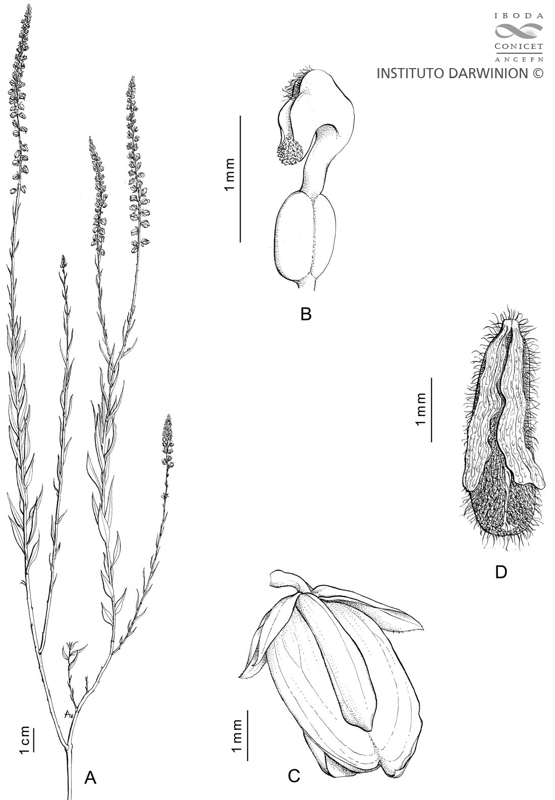 Hierbas de 20-150 cm de largo, erectas; tallos ramificados desde la base y en la parte media, pubérulos con tricomas cortos y curvos; entrenudos de la porción media de los tallos de 4-30 mm de largo. Hojas alternas; pecíolos ca. 1 mm de largo; láminas lineares, oblongas o lanceoladas, de 10-45 × 0,3-10 mm, ápice agudo, pubérulas con tricomas cortos y curvos. Inflorescencias en racimos espiciformes, de 3-24 × 0,4-0,5 cm; brácteas lanceoladas, de 1,8-2 × 0,5-0,7 mm, ápice agudo, ciliadas, caducas en la antesis; bractéolas lanceoladas, ca. 0,8 × 0,1 mm, ápice agudo, el margen glabro o ciliado, caducas. Flores de 3,5-4 mm de largo; pedicelos ca. 0,5-1 mm de largo, glabros; cáliz blanco-verdoso; sépalos externos pubescentes en sus márgenes; sépalo externo inferior, lanceolado, ca. 2,5 × 1 mm, cóncavo, ápice agudo; sépalos externos superiores lanceolados, ca. 2 × 0,7 mm, ápice agudo, libres; sépalos internos “alas” elípticos, ca. 2,7 × 2 mm, ápice obtuso, gabros; corola blanca, quilla ca. 3 mm de largo, cuña ca. 1 mm de largo, cresta con 8-10 lóbulos; pétalos laterales elípticos, ca. 2,7 × 1 mm, ápice obtuso, fusionados con la vaina estaminal a través de 1/3 de su margen, glabros, sin manchas violáceas; estambres 8, vaina estaminal ca. 1,5 mm de largo, glabra, porción libre de los filamentos estaminales mayor o igual que el largo de las anteras, ca. 0,2 mm de largo, anteras poricidas; ovario elipsoide, de 0,8-1 × 0,4-0,5 mm, levemente alado en el lóculo adaxial, asimétrico; estilo curvo en forma de “U”, ca. 1 mm de largo, área estigmática con el lóbulo estéril terminado en un mechón de tricomas escasos, márgenes glabros, lóbulo fértil sobre un breve soporte. Fruto una cápsula elipsoide, de 2-4,5 × 1,5-2,5 mm, asimétrica, el margen adaxial alado, glabras. Semillas cilíndricas, ca. 3 × 1 mm, pubescentes, rostro poco desarrollado; elaiosomas lineares o irregulares, de hasta 1/2 el largo total de la semilla, libres.