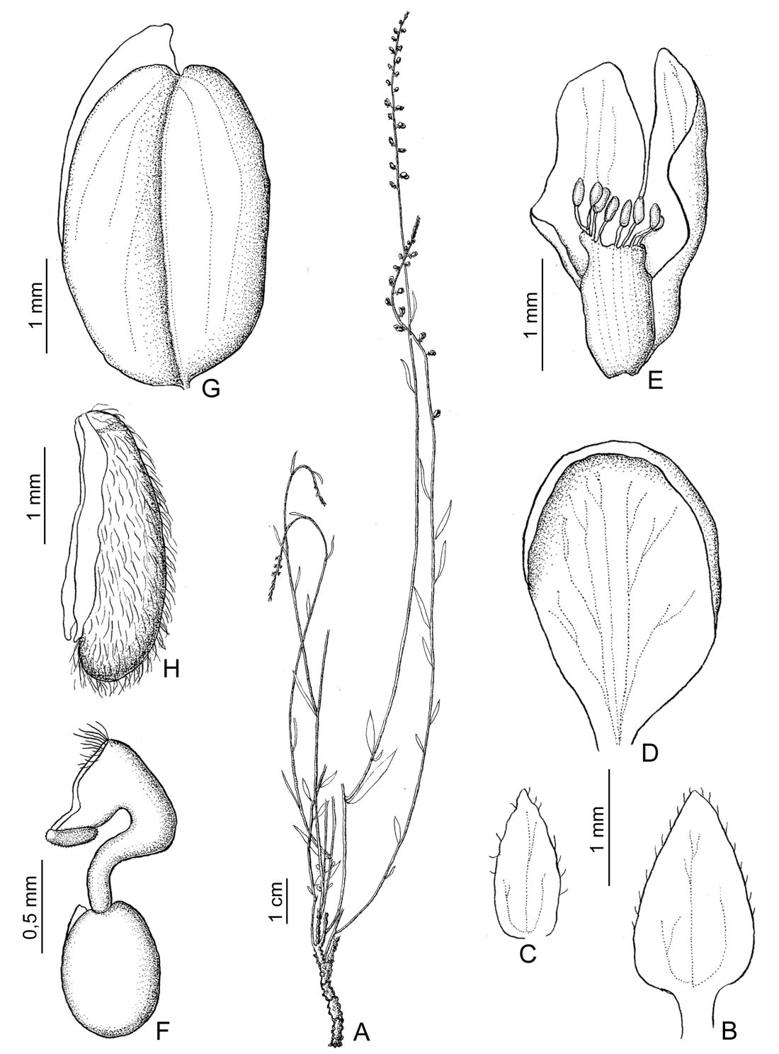 Hierbas de 20-150 cm de largo, erectas; tallos ramificados desde la base y en la parte media, pubérulos con tricomas cortos y curvos; entrenudos de la porción media de los tallos de 4-30 mm de largo. Hojas alternas; pecíolos ca. 1 mm de largo; láminas lineares, oblongas o lanceoladas, de 10-45 × 0,3-10 mm, ápice agudo, pubérulas con tricomas cortos y curvos. Inflorescencias en racimos espiciformes, de 3-24 × 0,4-0,5 cm; brácteas lanceoladas, de 1,8-2 × 0,5-0,7 mm, ápice agudo, ciliadas, caducas en la antesis; bractéolas lanceoladas, ca. 0,8 × 0,1 mm, ápice agudo, el margen glabro o ciliado, caducas. Flores de 3,5-4 mm de largo; pedicelos ca. 0,5-1 mm de largo, glabros; cáliz blanco-verdoso; sépalos externos pubescentes en sus márgenes; sépalo externo inferior, lanceolado, ca. 2,5 × 1 mm, cóncavo, ápice agudo; sépalos externos superiores lanceolados, ca. 2 × 0,7 mm, ápice agudo, libres; sépalos internos “alas” elípticos, ca. 2,7 × 2 mm, ápice obtuso, gabros; corola blanca, quilla ca. 3 mm de largo, cuña ca. 1 mm de largo, cresta con 8-10 lóbulos; pétalos laterales elípticos, ca. 2,7 × 1 mm, ápice obtuso, fusionados con la vaina estaminal a través de 1/3 de su margen, glabros, sin manchas violáceas; estambres 8, vaina estaminal ca. 1,5 mm de largo, glabra, porción libre de los filamentos estaminales mayor o igual que el largo de las anteras, ca. 0,2 mm de largo, anteras poricidas; ovario elipsoide, de 0,8-1 × 0,4-0,5 mm, levemente alado en el lóculo adaxial, asimétrico; estilo curvo en forma de “U”, ca. 1 mm de largo, área estigmática con el lóbulo estéril terminado en un mechón de tricomas escasos, márgenes glabros, lóbulo fértil sobre un breve soporte. Fruto una cápsula elipsoide, de 2-4,5 × 1,5-2,5 mm, asimétrica, el margen adaxial alado, glabras. Semillas cilíndricas, ca. 3 × 1 mm, pubescentes, rostro poco desarrollado; elaiosomas lineares o irregulares, de hasta 1/2 el largo total de la semilla, libres.