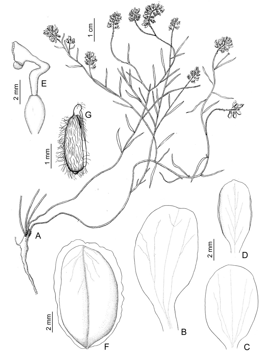 Hierbas de 4-35 cm de largo, erectas o postradas; tallos ramificados desde la base, glabros. Hojas alternas, separadas entre sí a una distancia hasta de 1 cm, sésiles; láminas lineares a oblongas, de 5-10 × 1-2 mm, de ápice agudo u obtuso, glabras. Inflorescencias en racimos capituliformes a espiciformes, de 1-2 × 0,7-1 cm, congestos o laxos, con una distancia entre las flores hasta de 2,5 mm en la porción media de la inflorescencia; brácteas romboidales a lanceoladas, de 1-1,4 × 0,5-1 mm, ápice agudo, generalmente caducas en la antesis, glabras; bractéolas lineares a lanceoladas, de 0,5-0,8 × 0,1-0,2 mm, ápice agudo, glabras, caducas o persistentes. Flores de 3,5-5 mm de largo; pedicelos de 0,5-1 mm de largo, glabros; cáliz blanco con una estría violácea oscura en el medio; sépalos externos glabros; sépalo externo inferior ovado, de 2-2,3 × 1,5 mm, cóncavo, ápice obtuso, a veces levemente cuspidado; sépalos externos superiores ovados a lanceolados, de 2 × 0,8-1,1 mm, ápice agudo u obtuso, libres; sépalos internos “alas” oblongos, de 3-4 × 2 mm, unguiculados, levemente asimétricos, ápice obtuso a truncado, glabros; corola blanca a violácea; quilla ca. 3 mm de largo, cuña ca. 1 mm de largo, cresta con 10-18 lóbulos; pétalos laterales oblongos a romboidales, de 2,5-3,1 × 1-1,5 mm, ápice obtuso, fusionados con la vaina estaminal a través de 1/4 de su margen, glabros, pubescentes en la porción media adaxial, con mancha violácea en el ápice; estambres 8, vaina estaminal de 1,5-1,7 mm de largo, glabra o levemente pubescente en sus márgenes, porción libre de los filamentos estaminales igual o mayor que el largo de las anteras, de 0,5-0,6 mm de largo, anteras poricidas; ovario elipsoide, de 0,8 × 0,5 mm, simétrico, glabro; estilo geniculado, de 1,5-1,7 mm de largo, área estigmática con el lóbulo estéril agudo, ciliado o glabro en sus márgenes, márgenes parcialmente cubriendo al lóbulo fértil. Fruto una cápsula de contorno oblongo o elipsoide, de 3-4 × 2 mm, simétrica, margen irregular y levemente alado, glabra. Semillas cilíndricas, de 2,5-3 × 1 mm, pubescentes, rostro desarrollado; elaiosomas lineares, hasta de 1/2 del largo total de la semilla, libres, a veces portando un pequeño arilo en la base de la semilla.