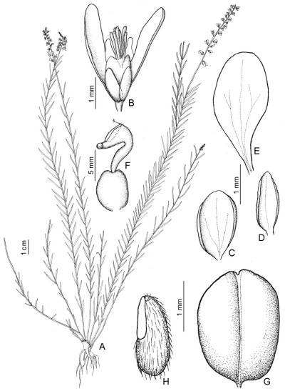 Hierbas de 15-20 cm de largo, erectas; tallos ramificados desde la base, ocasionalmente en la porción media, pubérulos. Hojas alternas, sésiles; láminas lineares a lanceoladas, de 3-10 × 0,8 mm, ápice agudo, pubérulas. Inflorescencias en racimos espiciformes, de 3-6 × 0,6-0,9 cm, laxos; brácteas lanceoladas, ca. 1,5 × 0,4 mm, ápice agudo, ciliadas, caducas en la antesis; bractéolas lanceoladas, de 1 × 0,3 mm, ápice agudo, glabras, caducas. Flores ca. 3,5 mm de largo; pedicelos ca. 0,7 mm de largo, glabros; cáliz blanco; sépalos externos glabros; sépalo externo inferior ovado-elíptico, ca. 1,5 × 0,7 mm, cóncavo, ápice obtuso; sépalos externos superiores elípticos, ca. 1,5 × 0,5 mm, ápice agudo, libres; sépalos internos “alas” espatulados, de 2,5 × 1,3 mm, ápice obtuso, glabros; corola blanca; quilla ca. 2,7 mm de largo, cuña ca. 0,7 mm de largo, cresta ca. 10 lóbulos; pétalos laterales elípticos, de 2 × 1 mm, ápice agudo, fusionados con la vaina estaminal a través de 1/4 de su margen, glabros, manchas no reportadas; estambres 8, vaina estaminal ca. 1,2 mm de largo, glabra, porción libre de los fi lamentos estaminales mayor que el largo de las anteras, ca. 0,2 mm de largo, anteras poricidas; ovario elipsoide, ca. 0,6 × 0,5 mm, simétrico, glabro; estilo curvo en forma de “U”, ca. 0,8 mm de largo, área estigmática con el lóbulo estéril terminado en un mechón de tricomas escasos, márgenes glabros, lóbulo fértil sobre un breve soporte. Fruto una cápsula elipsoide, ca. 1,5 × 1,6 mm, simétrica o levemente asimétrica, margen no alado, glabro. Semillas elipsoides, de 1,3 × 0,6 mm, pubescentes, rostro desarrollado; elaiosomas lineares, del largo total de la semilla, libres.