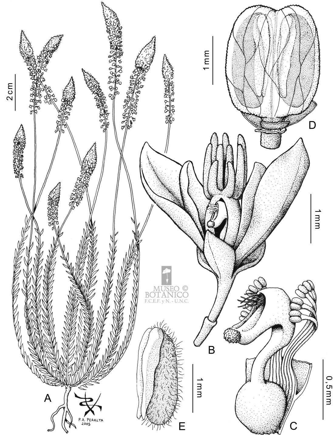 Hierbas de 7-40 cm de largo, erectas a decumbentes; tallos ramificados desde la base, ocasionalmente en la parte media, pubérulos. Hojas alternas a alterno-espiraladas, sésiles; láminas lanceoladas, de 4-7 × 0,9-1 mm, ápice agudo, pubérulas. Inflorescencias en racimos espiciformes, de 1,5-12 × 0,6-0,9 cm, compactos; brácteas lanceoladas, de 1,2-2,2 × 0,3-0,5 mm, ápice agudo, glabras o remotamente ciliadas, caducas en la antesis; bractéolas lanceoladas, de 0,5 × 0,2 mm, ápice agudo, glabras, caducas. Flores de 2,5-3 mm de largo; pedicelos ca. 1 mm de largo, glabros; cáliz blanco o blanco-violáceo; sépalos externos glabros; sépalo externo inferior ovado-elíptico, de 1,5-1,7 × 0,6-0,7 mm, cóncavo, ápice agudo; sépalos externos superiores elípticos, de 1,5-1,6 × 0,5-0,6 mm, ápice agudo, libres; sépalos internos “alas” elípticos, de 2-3 × 1-1,5 mm, ápice obtuso, glabros; corola blanca a violácea; quilla de 2-2,5 mm de largo, cuña ca. 0,2 mm de largo, cresta con 6-10 lóbulos; pétalos laterales elípticos, de 1,7-2,1 × 0,7-1,1 mm, ápice obtuso, fusionados con la vaina estaminal a través de 1/4 de su margen, glabros, sin manchas violáceas; estambres 8, vaina estaminal de 1-1,1 mm de largo, glabra, porción libre de los fi lamentos estaminales igual o mayor que el largo de las anteras, ca. 0,3 mm de largo, anteras poricidas; ovario elipsoide, ca. 0,5 × 0,4 mm, simétrico, glabro; estilo curvo en forma de “U”, de 0,6-0,9 mm de largo, área estigmática con el lóbulo estéril terminado en un mechón de tricomas escasos, márgenes glabros, lóbulo fértil sobre un breve soporte. Fruto una cápsula elipsoide, de 1,5-3,5 × 1,2-1,8 mm, simétrica o levemente asimétrica, margen no alado, glabra. Semillas elipsoidales, de 1,5-1,7 × 0,5-0,7 mm, pubescentes, rostro desarrollado; elaiosomas lineares, de 2/3 del largo de la semilla, libres, a veces portando un pequeño arilo en la base de la semilla.