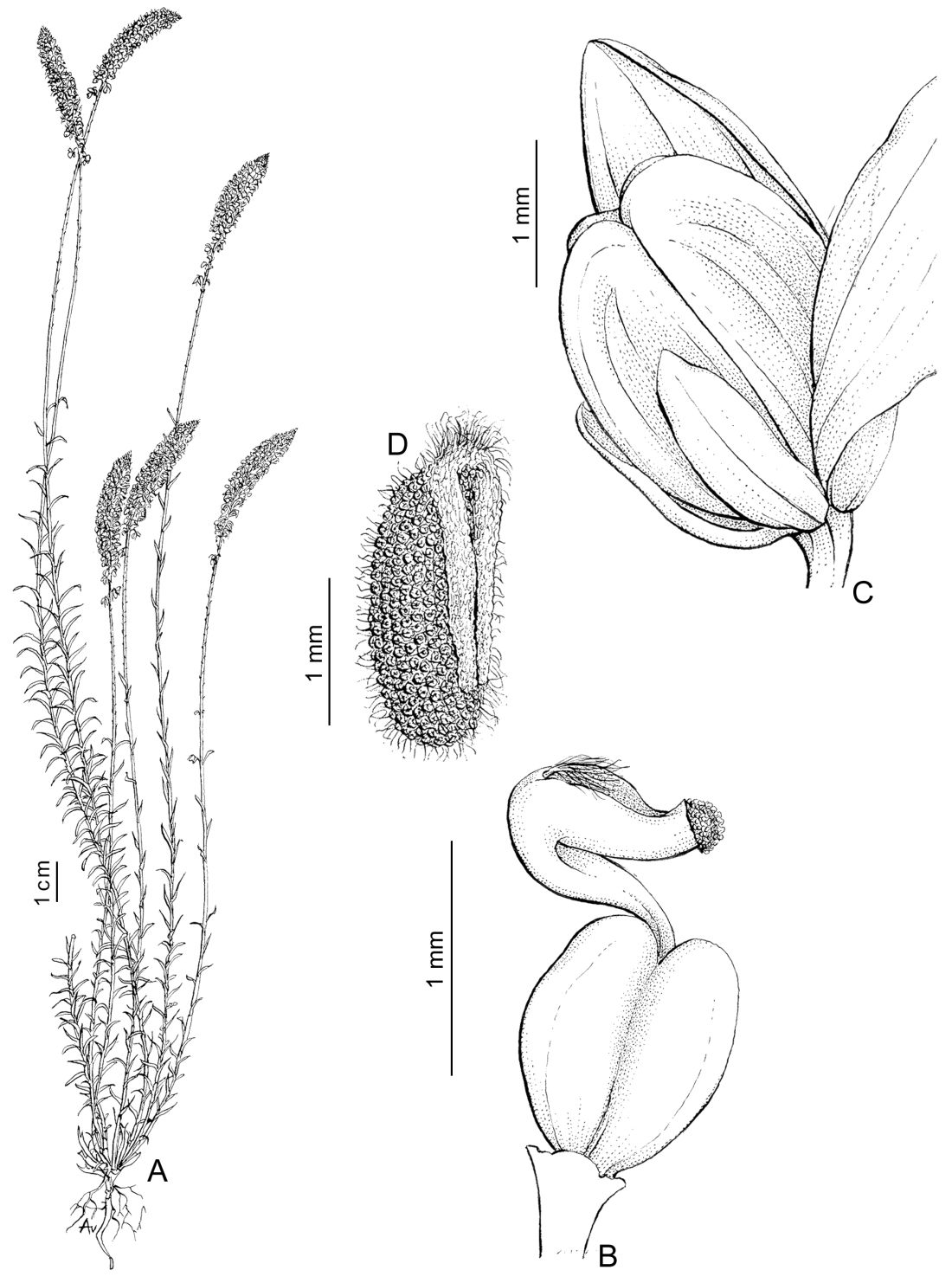 Hierbas de 7-40 cm de largo, erectas a decumbentes; tallos ramificados desde la base, ocasionalmente en la parte media, pubérulos. Hojas alternas a alterno-espiraladas, sésiles; láminas lanceoladas, de 4-7 × 0,9-1 mm, ápice agudo, pubérulas. Inflorescencias en racimos espiciformes, de 1,5-12 × 0,6-0,9 cm, compactos; brácteas lanceoladas, de 1,2-2,2 × 0,3-0,5 mm, ápice agudo, glabras o remotamente ciliadas, caducas en la antesis; bractéolas lanceoladas, de 0,5 × 0,2 mm, ápice agudo, glabras, caducas. Flores de 2,5-3 mm de largo; pedicelos ca. 1 mm de largo, glabros; cáliz blanco o blanco-violáceo; sépalos externos glabros; sépalo externo inferior ovado-elíptico, de 1,5-1,7 × 0,6-0,7 mm, cóncavo, ápice agudo; sépalos externos superiores elípticos, de 1,5-1,6 × 0,5-0,6 mm, ápice agudo, libres; sépalos internos “alas” elípticos, de 2-3 × 1-1,5 mm, ápice obtuso, glabros; corola blanca a violácea; quilla de 2-2,5 mm de largo, cuña ca. 0,2 mm de largo, cresta con 6-10 lóbulos; pétalos laterales elípticos, de 1,7-2,1 × 0,7-1,1 mm, ápice obtuso, fusionados con la vaina estaminal a través de 1/4 de su margen, glabros, sin manchas violáceas; estambres 8, vaina estaminal de 1-1,1 mm de largo, glabra, porción libre de los fi lamentos estaminales igual o mayor que el largo de las anteras, ca. 0,3 mm de largo, anteras poricidas; ovario elipsoide, ca. 0,5 × 0,4 mm, simétrico, glabro; estilo curvo en forma de “U”, de 0,6-0,9 mm de largo, área estigmática con el lóbulo estéril terminado en un mechón de tricomas escasos, márgenes glabros, lóbulo fértil sobre un breve soporte. Fruto una cápsula elipsoide, de 1,5-3,5 × 1,2-1,8 mm, simétrica o levemente asimétrica, margen no alado, glabra. Semillas elipsoidales, de 1,5-1,7 × 0,5-0,7 mm, pubescentes, rostro desarrollado; elaiosomas lineares, de 2/3 del largo de la semilla, libres, a veces portando un pequeño arilo en la base de la semilla.